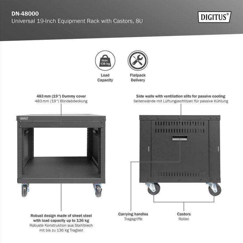DIGITUS DN-48000 Mobilní Síťový stojan 8U, univerzální, 420x507x460mm, barva černá (RAL 9005)