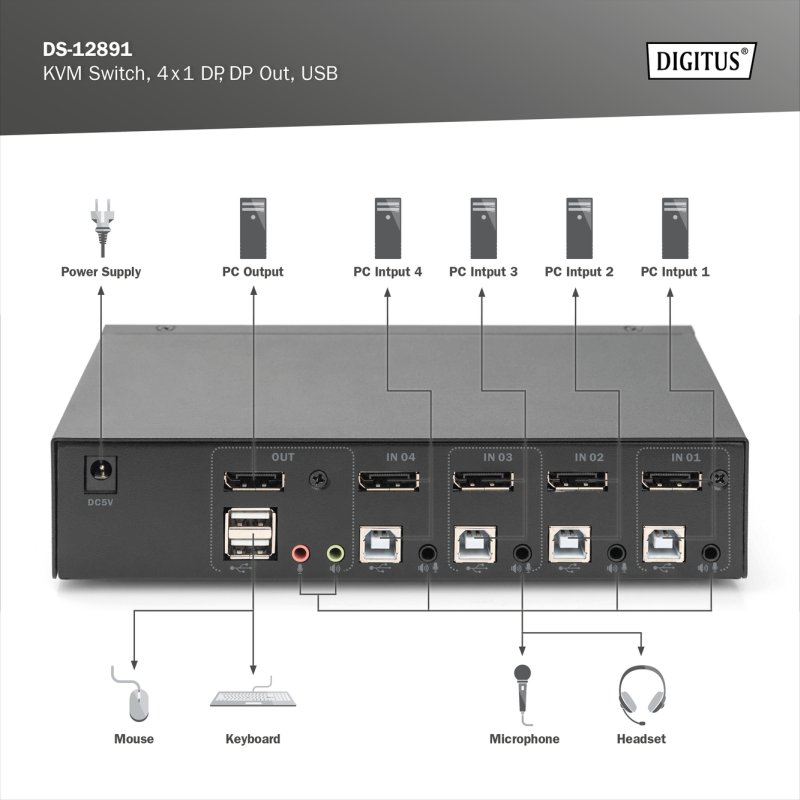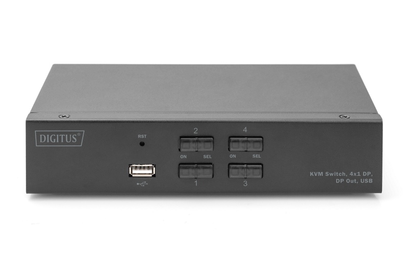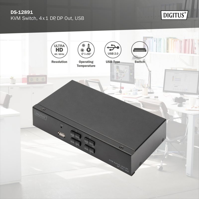 DIGITUS DS-12891 KVM Switch, 4x DP in, DP Out, 4x USB B, 4K @ 60 Hz, černá