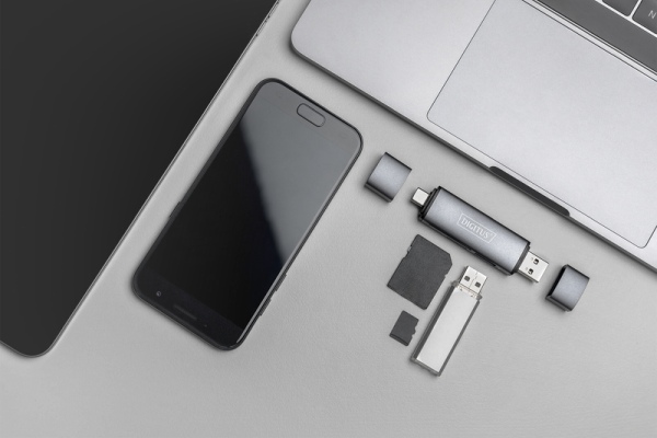 Digitus dvojitá čtečka karet OTG (USB-C + USB 3.0) 1x SD, 1x MicroSD, 1x USB 3.0, šedá