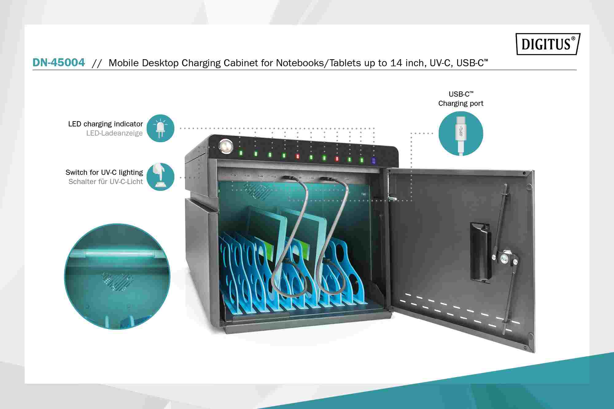 DIGITUS mobilní stolní nabíjecí skříňka pro notebooky/tablety do 14 palců, 10 zařízení. UV-C, USB-C ( až 20W na zařízení)