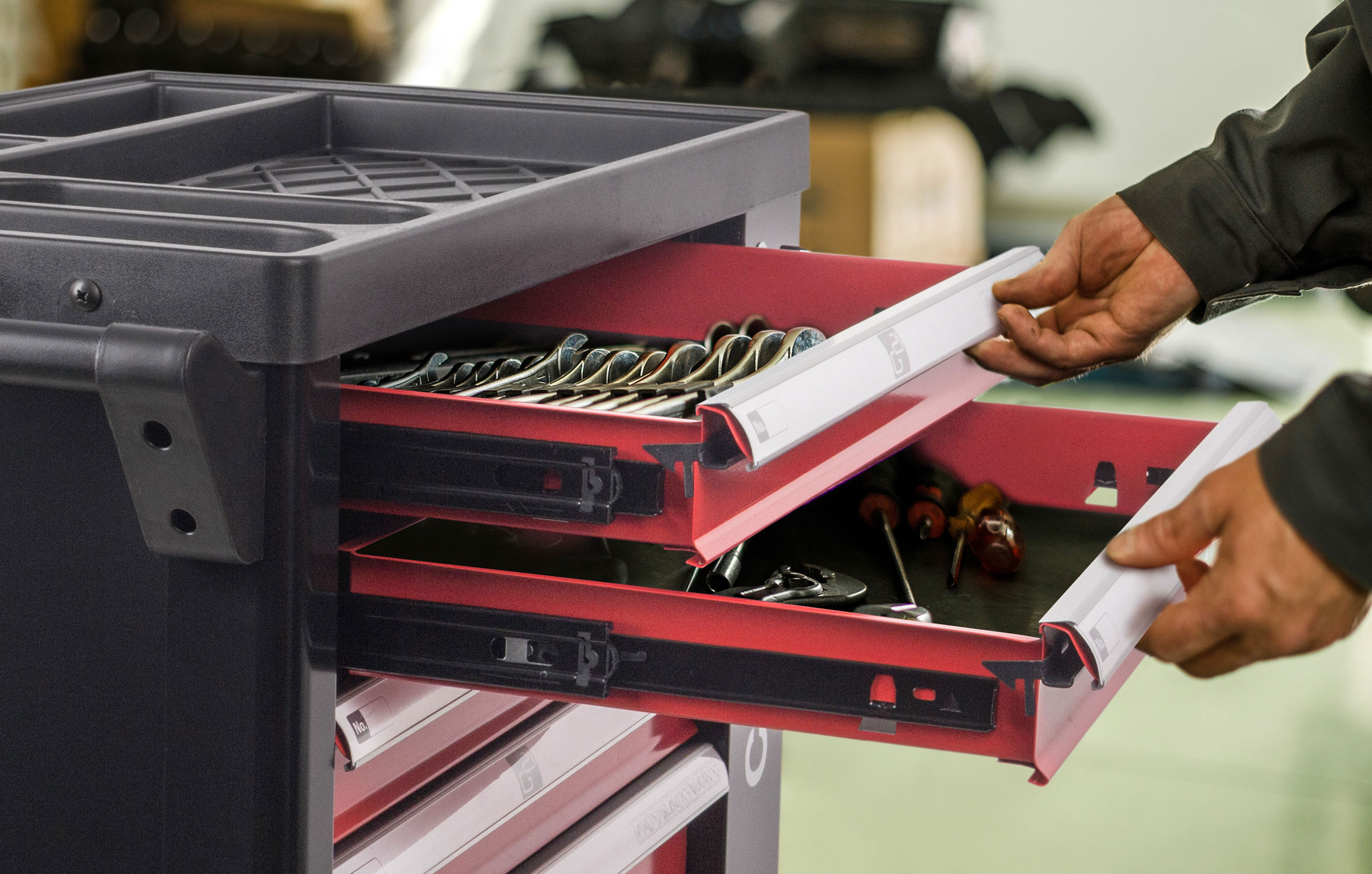 Náhodného otevření při přesouvání se bát nemusíte – všechny zásuvky jsou opatřeny bezpečnostní pojistkou, která nežádoucímu otevření zásuvek zabrání. Pro větší bezpečí uloženého nářadí jsme dílenský vozík navíc vybavili i centrálním zámkem pro zásuvky a zámkem pro boční skříňku.