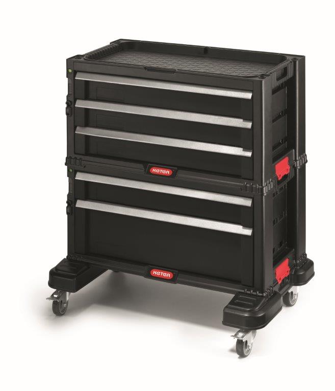 Dílenský vozík Keter s 5 zásuvkami nabízí úložný prostor pro velké množství nářadí, jako jsou šroubováky, kleště, vrtačky nebo aku nářadí a další nástroje a příslušenství. Je vyrobený z pevného a odolného plastu.