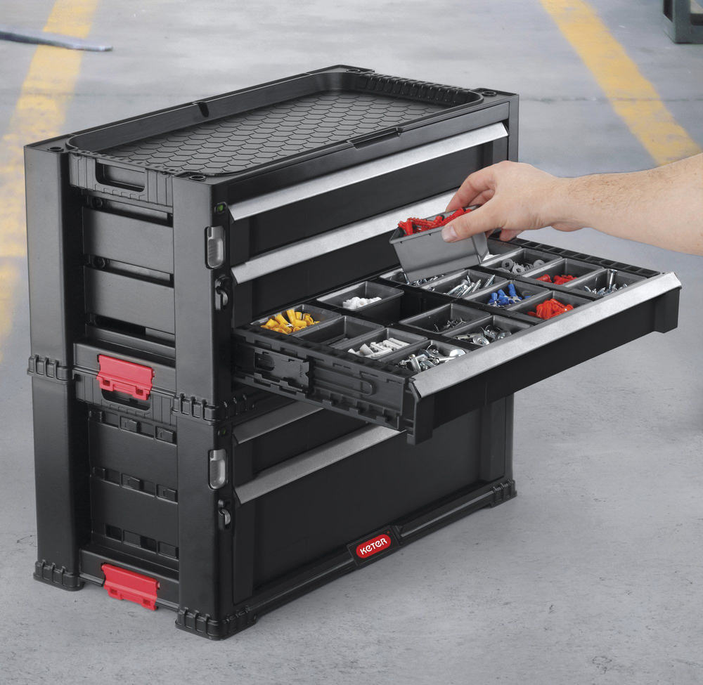 Úložný box na nářadí obsahuje jednu hlubokou zásuvku s odnímatelnými přihrádkami, do které můžete uložit velké a těžké nástroje. Další 4 zásuvky slouží pro uložení drobnějších nástrojů a příslušenství. Jedna ze čtyř menších zásuvek je vybavena 16 vyjímatelnými organizéry na drobné příslušenství, jako jsou hřebíky, šroubky, hmoždinky a jiné drobnosti. Organizéry umožňují snadné roztřídění příslušenství podle druhů a velikostí. Všechny dělící příčky v zásuvkách lze snadno vyjmout a vytvořit tak volný prostor pro větší nástroje. Každý samotný blok se zásuvkami lze zajistit proti otevření vestavěným posuvným zámkem. Nechybí ani očko pro zajištění visacím zámkem.
