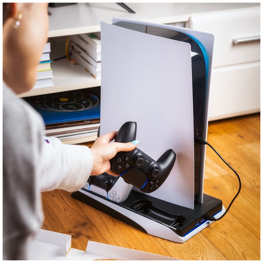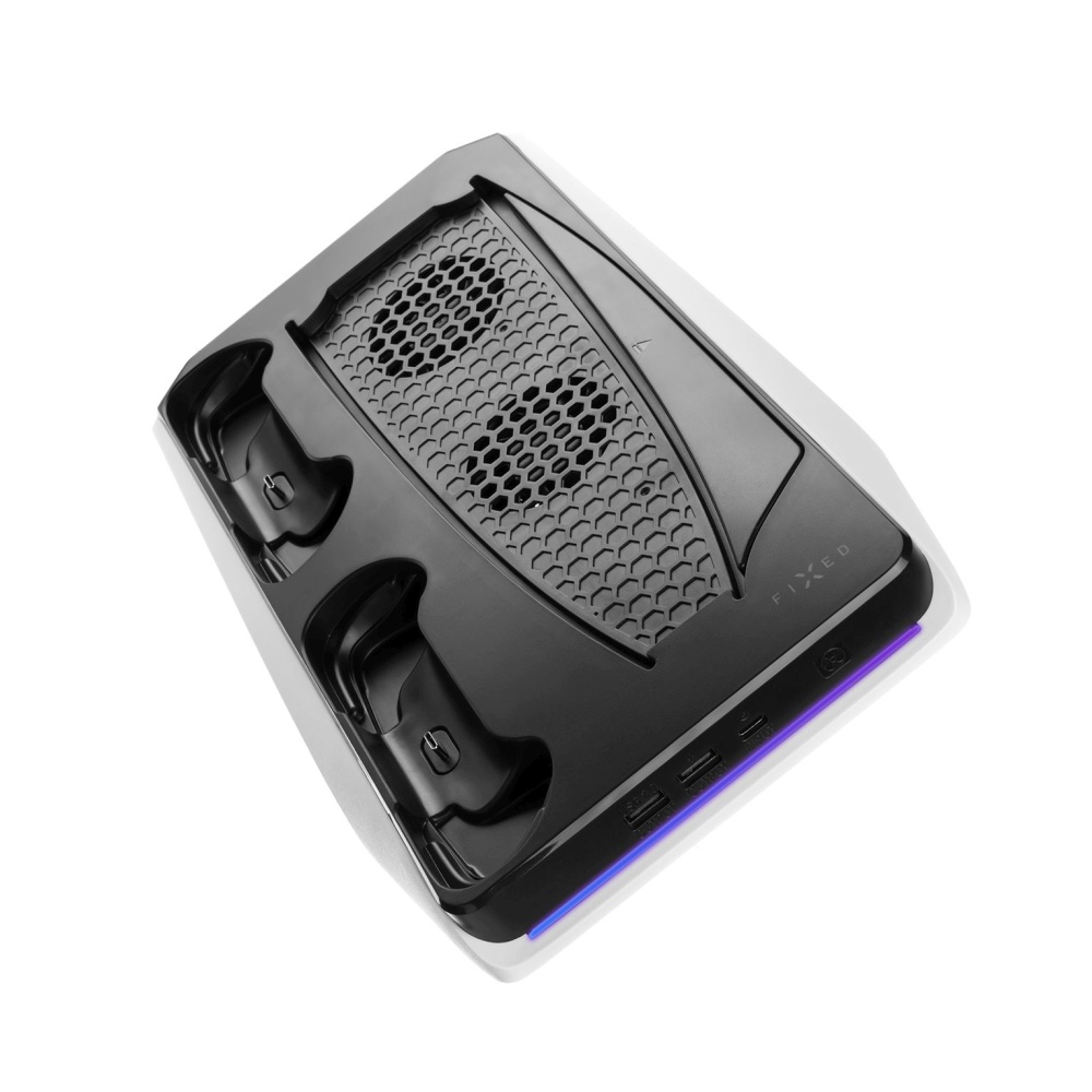 Dobíjecí stanice FIXED představuje praktickou kombinaci nabíječky pro dva ovladače, chladící podložky s dvojicí ventilátorů a držáku ke konzoli PlayStation 5. Zvládne nabít dva DualSense ovladače současně bez nutnosti připojovat je ke konzoli. Po každém hraní stačí ovladače zacvaknout do stanice. Stanice má funkci LED indikace stavu nabíjení. Jakmile připojíte ovladače k dokovací stanici, modré podsvícení vám začne signalizovat, že se ovladače nabíjí. Podsvícení můžete kdykoliv vypnout. Ovladač se plně dobije za 3,5 hodiny. Stanice je nabíjena konektorem USB-C. Samozřejmostí je ochrana ovladačů před přepětím, podpětím a další bezpečnostní prvky.