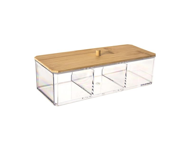 Kosmetická dělená dóza s víčkem uloží vatové tampóny i jiné kosmetické potřeby nebo líčidla. Využít ji můžete v koupelně ale i jinde v domácnosti na různé drobnosti. Dělena do tří sekcí. Vlastnosti: - Materiál: plast, bambusové dřevo - Rozměry: 23,5x9,5x6,5/7 cm