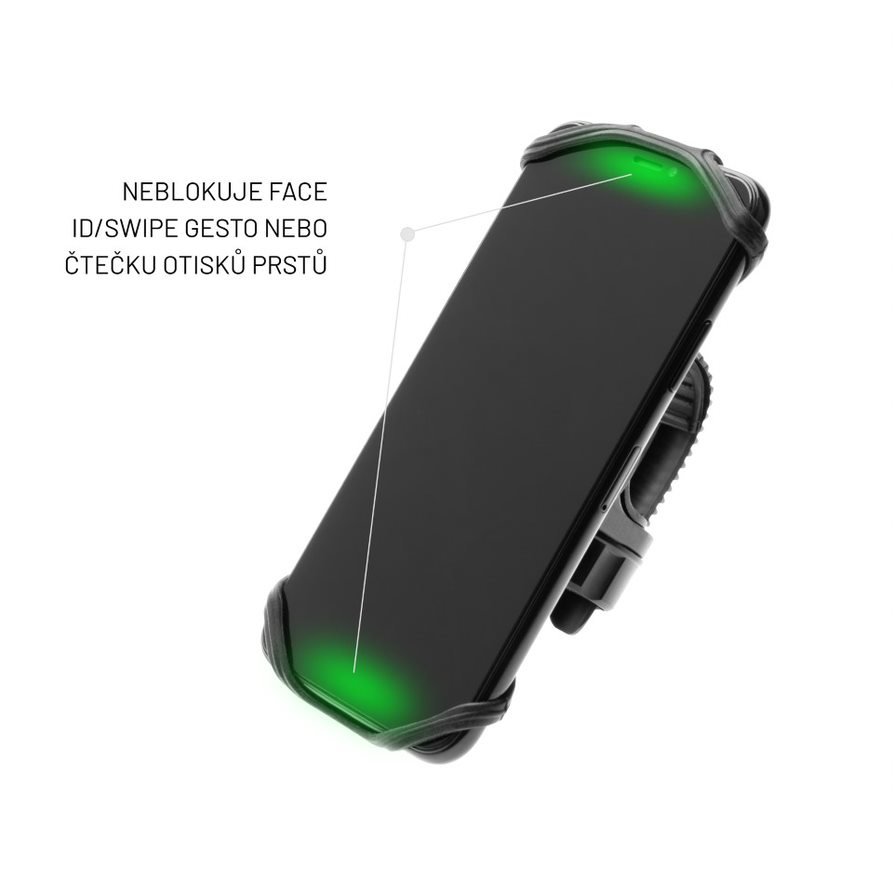 Tvar silikonových poutek pro uchycení telefonu je navržen tak, aby u daných telefonů nijak nebránil používání FaceID, Swipe i čtečce otisků prstů. Silikonová poutka držáku se dokonale přizpůsobí velikosti vloženého telefonu, jsou schopná bezpečně udržet všechny zařízení s úhlopříčkou 4 - 6,5 palců. Rotační základna držáku umožní natočit telefon do horizontální i vertikální polohy.