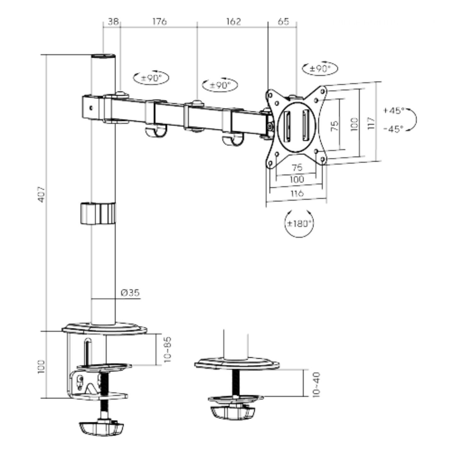 monitoru o 360°, nastavení úhlů ramene o 180° (2 závěsy po 90°)