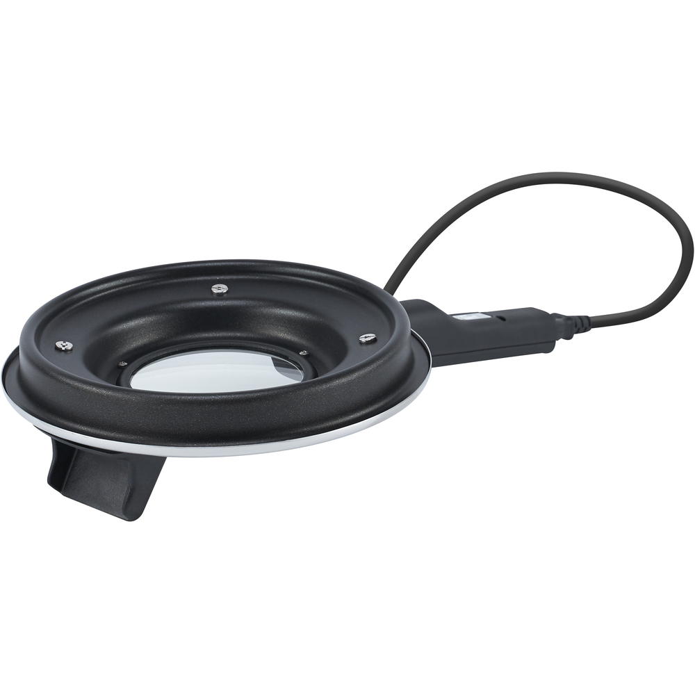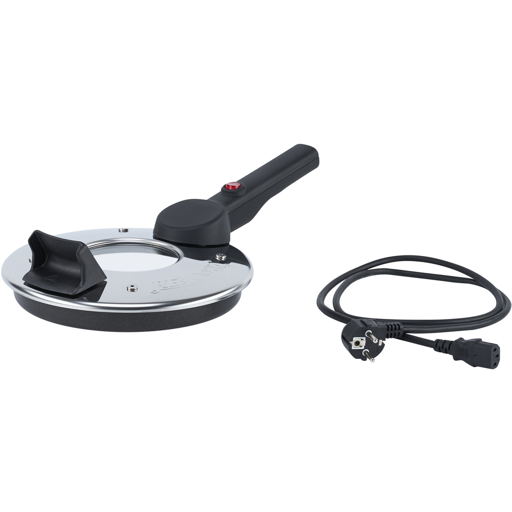 - Víko s topným tělesem: horní část víka je vyrobená z nerezového plechu. Dolní část víka je z hliníku a je potažená nepřilnavým povrchem Teflon® Classic. Přebytečná pára vznikající při pečení je odváděná dutými šrouby ve víku. Pečicí víko má skleněné okénko. Přívodní kabel s euro konektorem a evropskou zástrčkou je odnímatelný od držadla. Vypínač je umístěný na horní části držadla tak, aby kontrola stavu zap/vyp byla možná v jakékoliv poloze. Umístění vypínače na horní části držadla usnadňuje ovládání pro praváky i leváky. Víko je navrženo tak, aby mohlo být položeno na pracovní plochu topnou částí směrem vzhůru.
