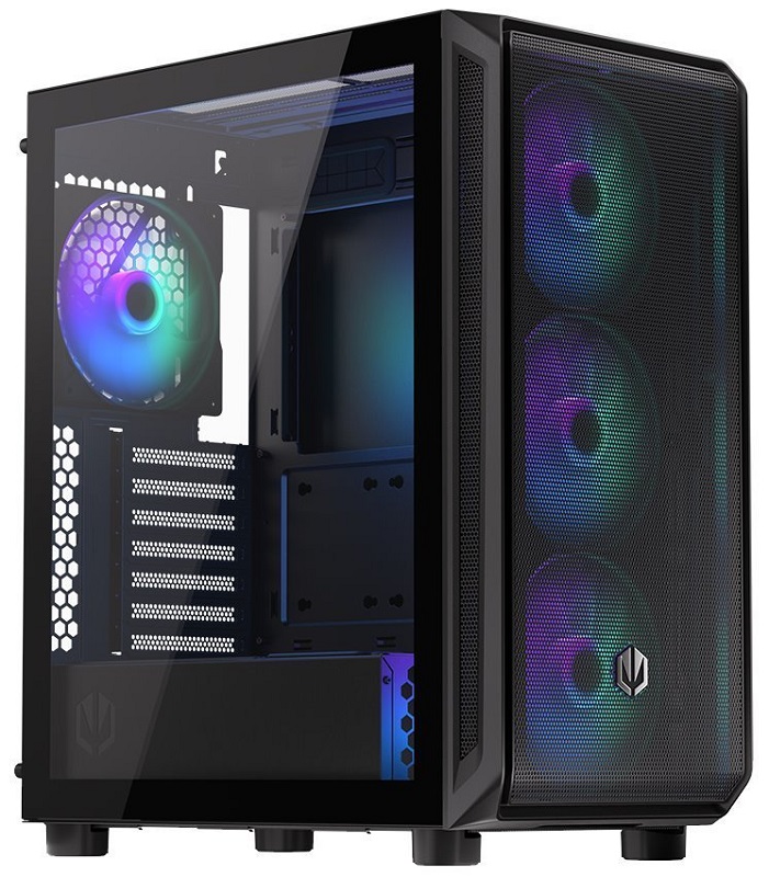 Skříň formátu Middle Tower s průhlednou bočnicí nabízí šest 2,5" pozic pro SSD disky a jednu 3,5" pozici pro pevný disk. Na horním panelu naleznete dva porty USB 3.0, jeden port USB-C a dále také konektor pro sluchátka a konektor pro mikrofon. Skříň je osazena čtyřmi ventilátory o velikosti 140 mm s ARGB podsvícením. Důmyslné…