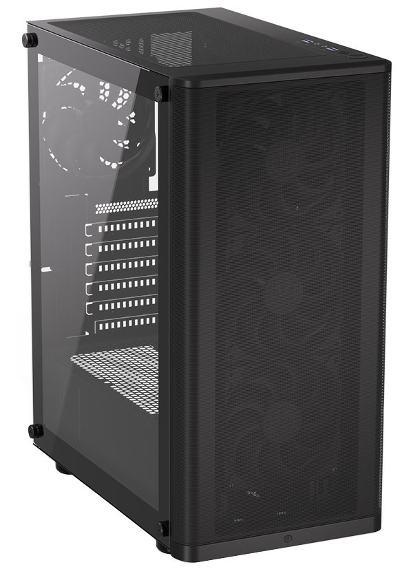 Skříň formátu Middle Tower s průhlednou bočnicí z tvrzeného skla nabízí dvě 2,5" pozice pro SSD disky a jednu 3,5" pozici pro pevný disk. Na horní části se nachází dva USB 3.0 porty, sluchátkový výstup a audio vstup pro mikrofon. Vybavena je čtyřmi 120 mm ventilátory, které spolu s perforovaným čelním panelem zajišťují dostatečné proudění vzduchu. Důmyslné řešení umožňuje pohodlné umístění až 360 mm dlouhého výměníku vodního chlazení na přední straně. Ve skříni je dostatek prostoru pro chladič CPU do výšky až 161 mm a grafickou kartu o délce až 315 mm. Dodávána je bez zdroje. Součástí je také sada prachových filtrů.