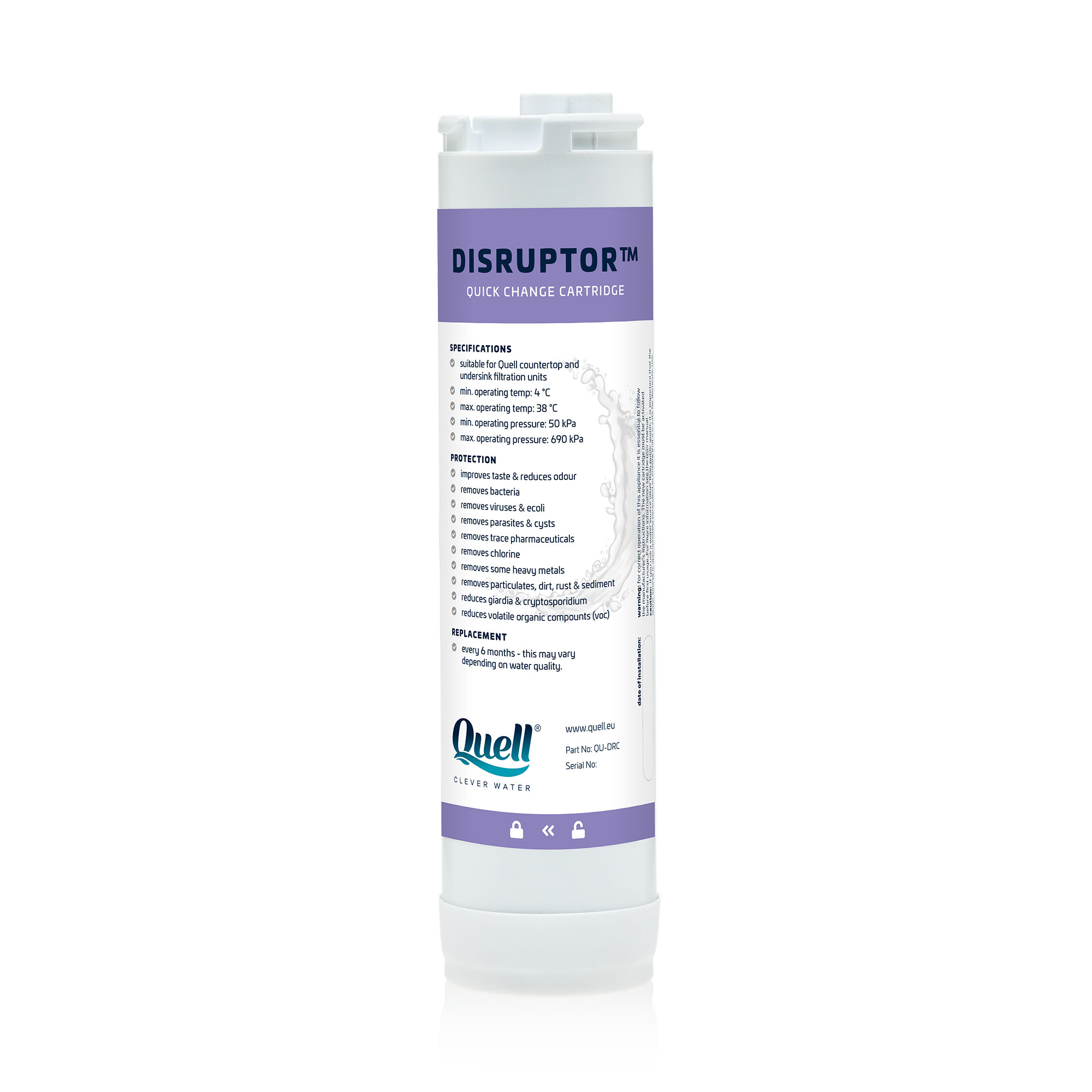 Filtrační patrona Disruptor™ je druhým stupněm filtrace ve filtračních zařízeních Quell. Jedná se o nejúčinnější filtr dostupný na trhu. Využívá proces zvaný elektroadsorpce, který při kontaktu s vodou vytváří elektrické pole. Odstraňuje a eliminuje téměř všechny nečistoty.