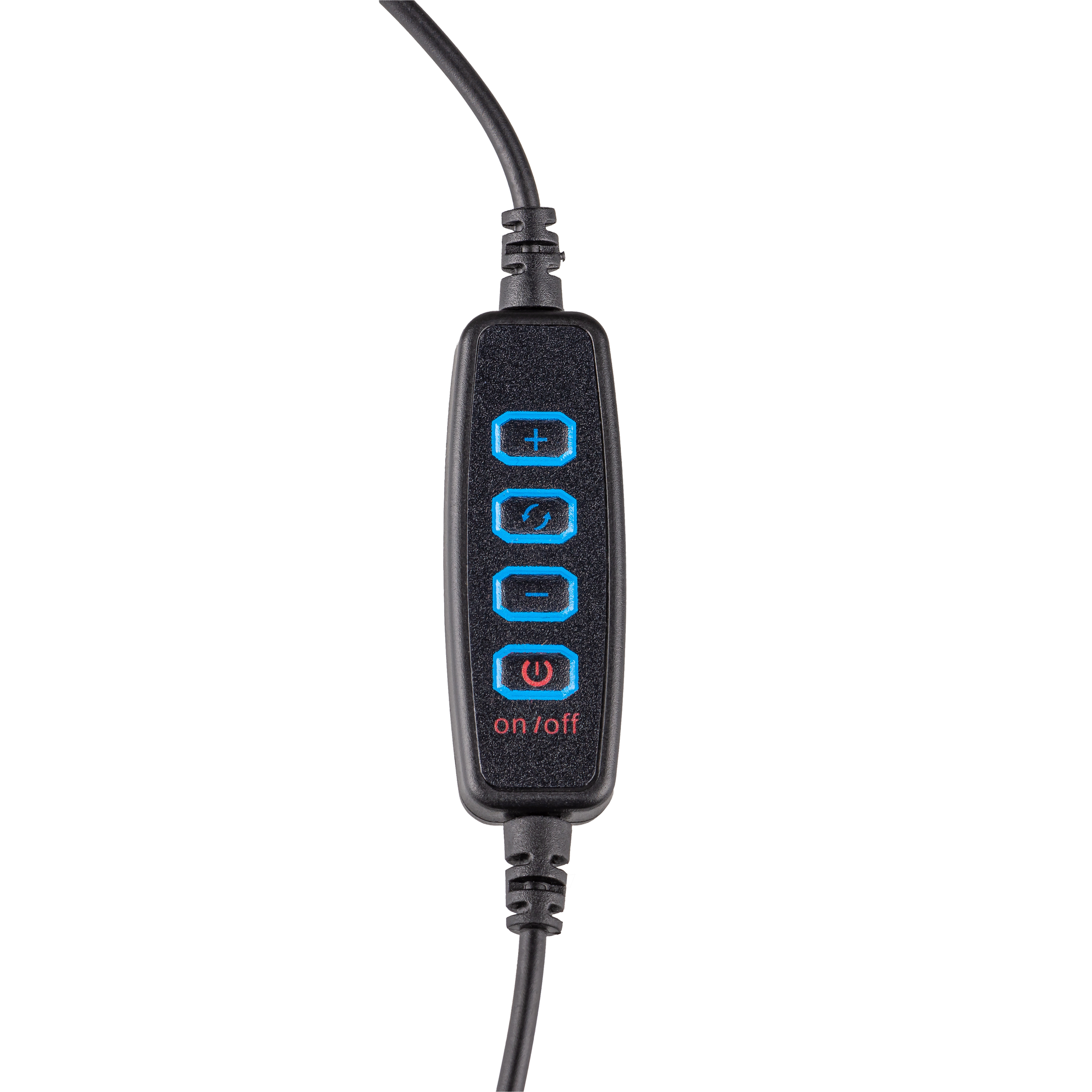 - Napájení osvětlení je zajištěné přes USB rozhraní, kdy je lampa upevněna přes 1/4″ šroubový závit na kulové hlavě