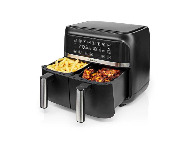 Tato Nedis dvojitá horkovzdušná fritéza s výkonem 2 850 wattů má mimořádně velký objem 7,6 litru, který je tvořen dvěma oddělenými koši, každý o objemu 3,8 litru. Díky technologii, která cirkuluje horký vzduch vysokou rychlostí, získáte opravdu křupavý pokrm s minimálním množstvím oleje, takže vaše jídlo bude zdravější a s nižším obsahem tuku. Kromě toho můžete s touto horkovzdušnou fritézou také péci, grilovat, opékat a dokonce sušit.
