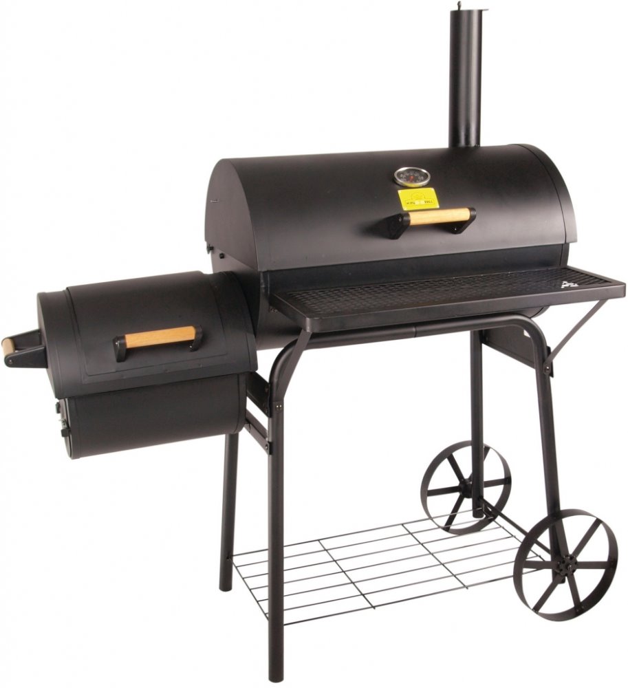 Velký zahradní gril s udírnou obsahuje dvě topeniště. Je vyrobený z ocelového plechu, který je ošetřen černou ohnivzdornou barvou. Má inteligentní systém regulace vzduchu a praktický vestavěný teploměr. Pro snadnou manipulaci a přemísťování grilu je gril opatřen praktickými kolečky.