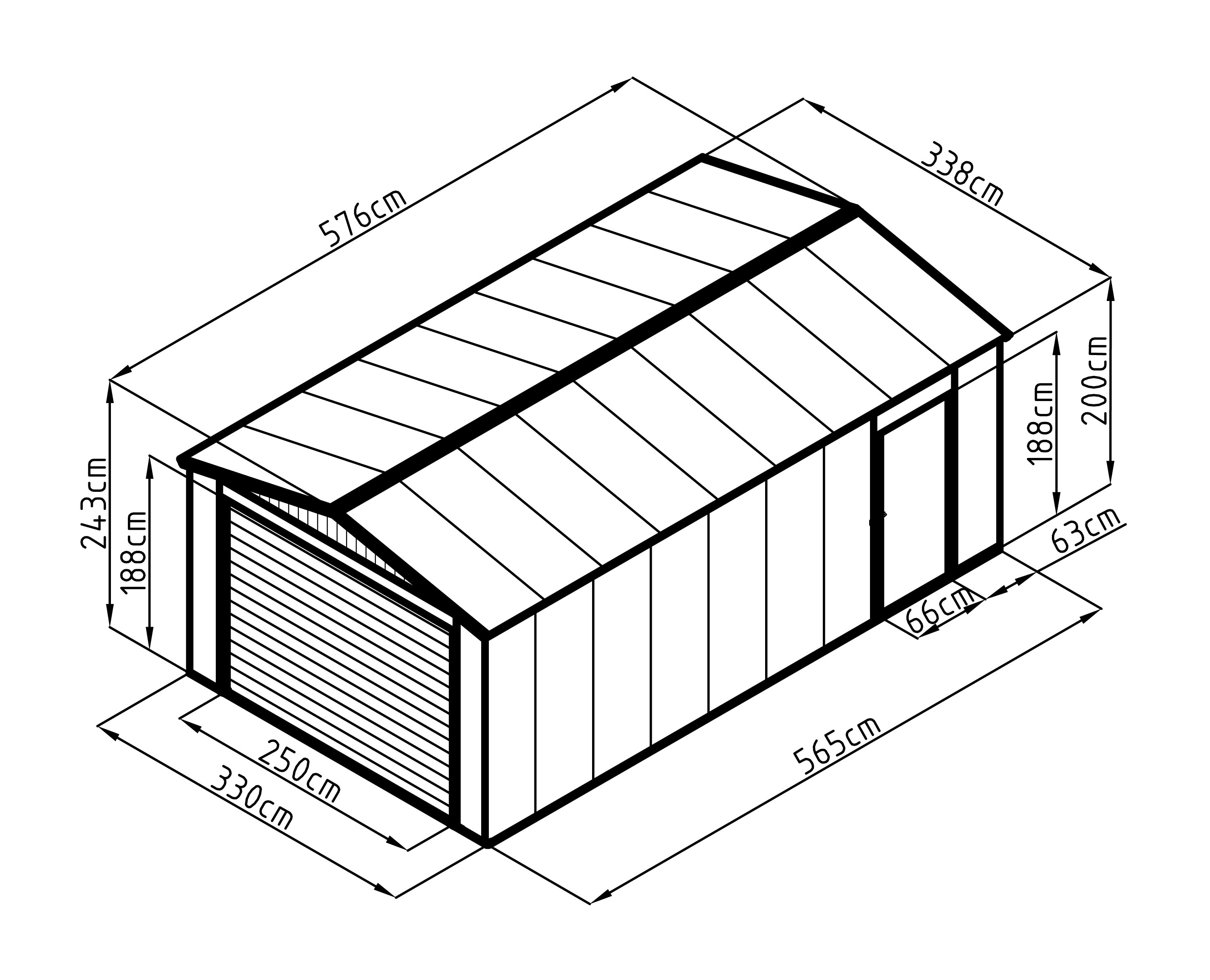 - Rozměry se střechou (š x d x v): 338 x 576 x 243 cm