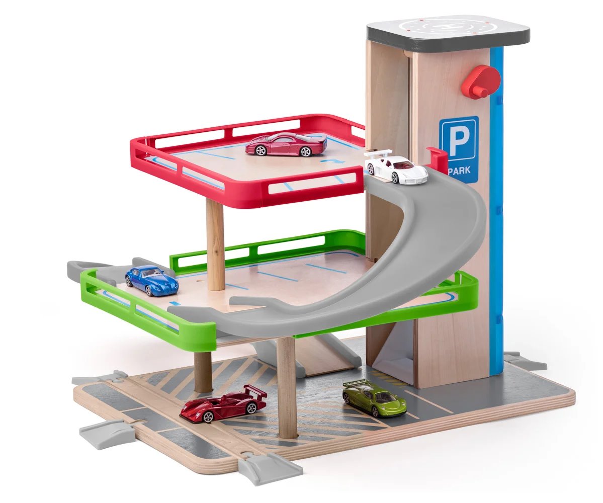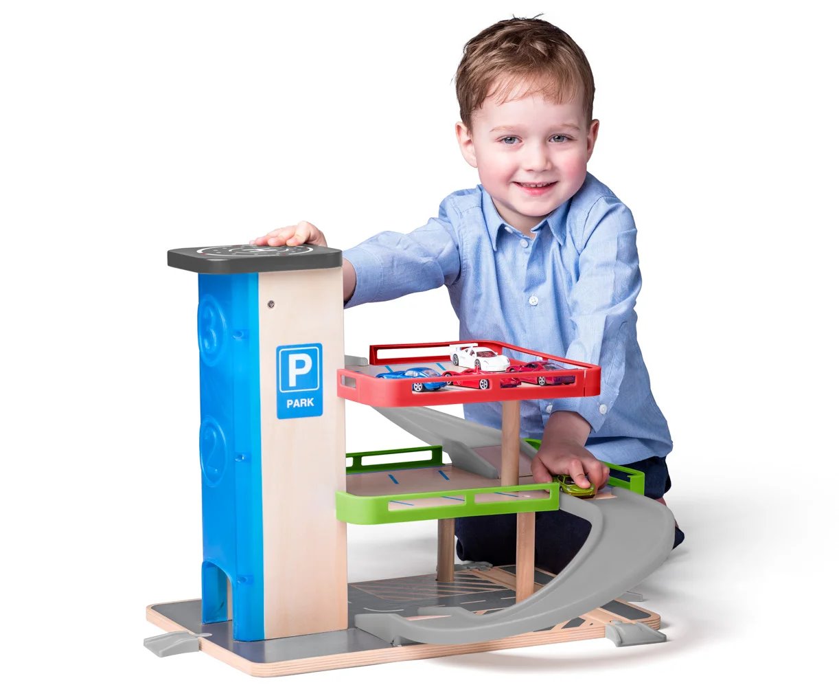 Dřevěná garáž Woody s výtahem je skvělá zábava pro malé motoristy. Jednoduše zajeďte se svým autíčkem do výtahu, nechte se vyvézt do nejvyššího patra a zaparkujte nebo si sjeďte o patro níže. Garáž má tři úrovně nastavitelnosti výtahu. Výtah můžete jednoduše mechanicky posouvat nahoru a dolů díky otočnému kolečku. Sada obsahuje 7 dílů – 2 autíčka v dřevěno/palstovém provedení a magnetem na propojení, 2 plastové sjezdy mezi patry, plastové zábradlí, dřevěné parkovací plochy, 4 plastové koncovky pro sjezd/vjezd do garáže.