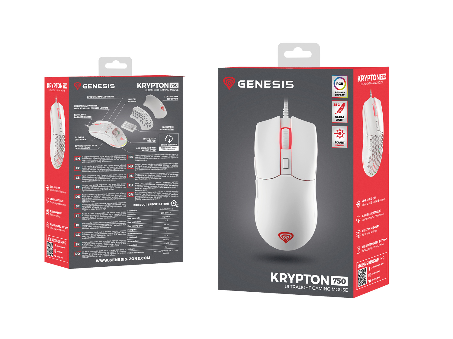 Genesis KRYPTON 750 je programovatelná herní myš s přesným optickým senzorem a softwarem, který umožňuje nahrávání maker a přiřazení různých funkcí. Je vybavena ergonomickým tvarem a RGB podsvícením s možností nastavení 16 milionů barev. Provedení dostupné v černé i bílé barvě.