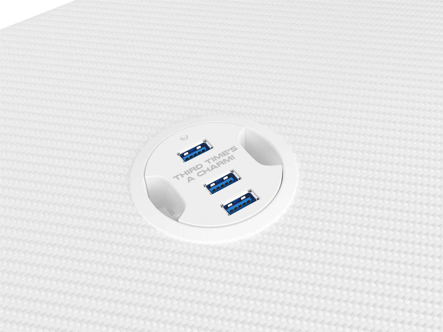 Stůl je vybaven HUBem se třemi porty USB 3.0 a přihrádkami na