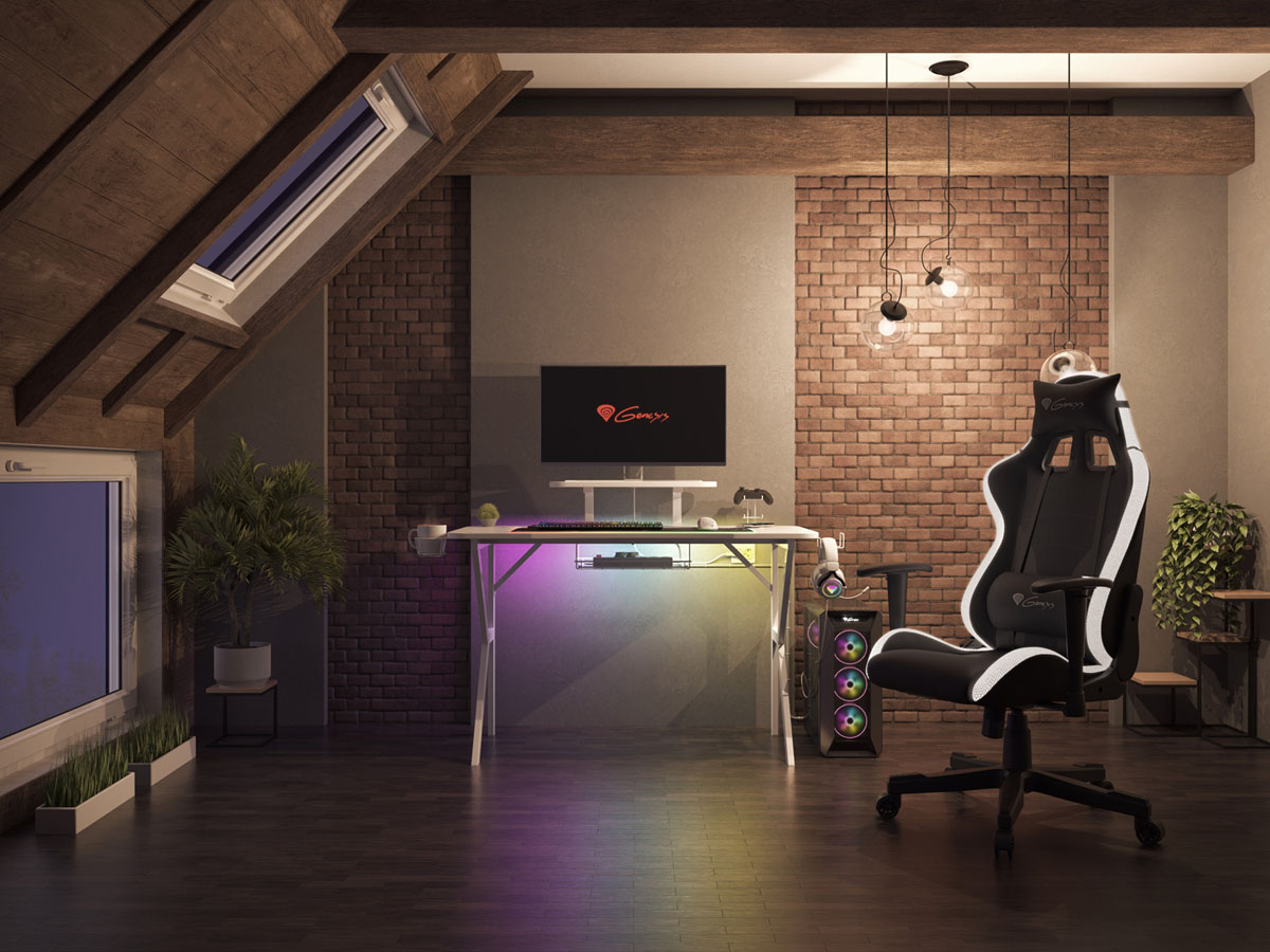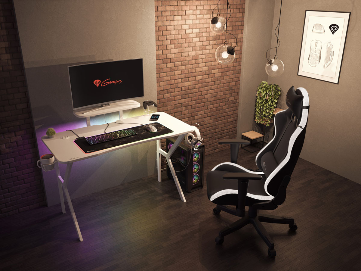 Genesis Holm 320 RGB je moderní bílý herní stůl, který dokonale