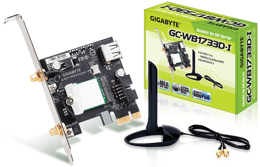 2x2 802.11ac Dual Band WIFI + BLUETOOTH 5 karta GC-WB1733D-I je exkluzivní PCIe příslušenství, které nabízí podporu pro nejnovější technologie 2x2 802.11ac 160MHz Dual Band WIFI a připojení BLUETOOTH 5.
