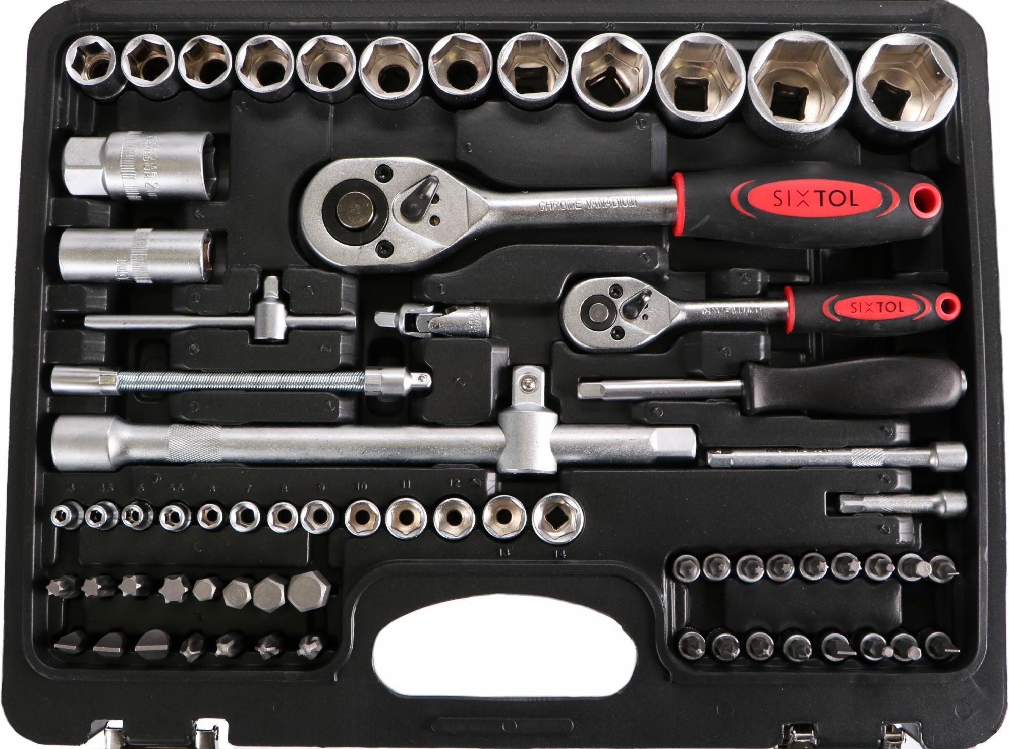 Potřebujete něco opravit nebo namontovat? Pořiďte si kompletní gola sadu Sixtol TOOL SET s celkem 82 díly hlavic, klíčů a bitů s ráčnami a buďte připraveni na jakoukoliv kutilskou činnost, která nastane. Jednotlivé díly najdete v odolném plastovém kufru, který se vám bude snadno přenášet a skladovat. Sada se hodí do každé dílny a garáže. Budete mít po ruce celou řadu nástrčných hlavic, zástrčných klíčů, očkoplochých klíčů, bitů, dvě ráčny, univerzální šroubovací rukojeť a mnoho dalšího.