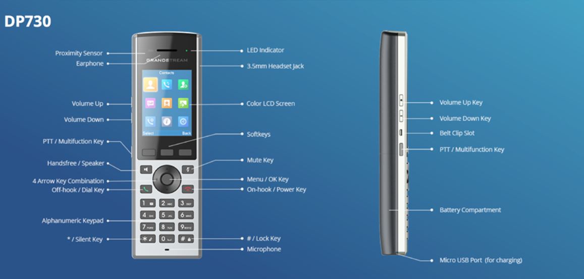 Grandstream DP730 je bezdrátová DECT ručka, která v kombinaci s DECT základnou stejného výrobce, byla navržena pro každodenní užívání ve firemním segmentu, především ve skladových, maloobchodních prostorách, dohledových centrech, zdravotnických zařízeních, či sdílených kancelářích. Své místo si může najít i u náročných uživatelů v domácnosti.
