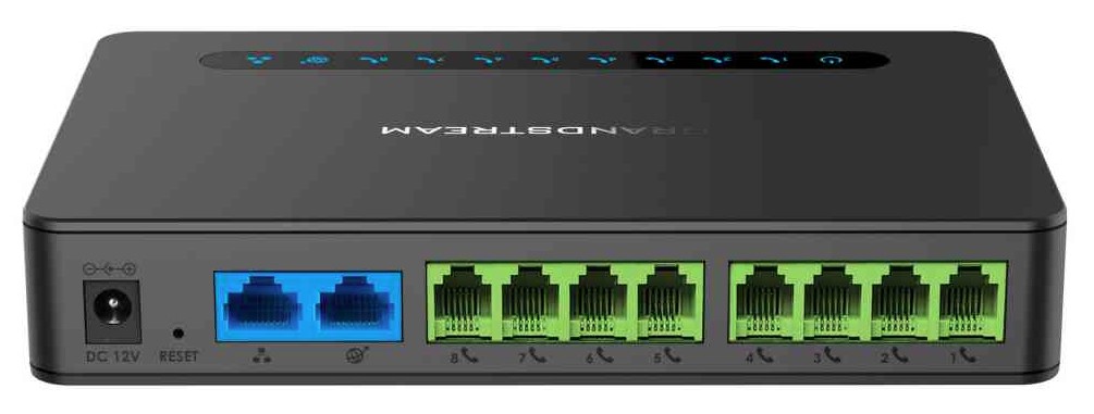 IP brána disponuje osmi FXS porty, dvěma SIP účty, duálním gigabitovým portem a integrovaným NAT routerem.