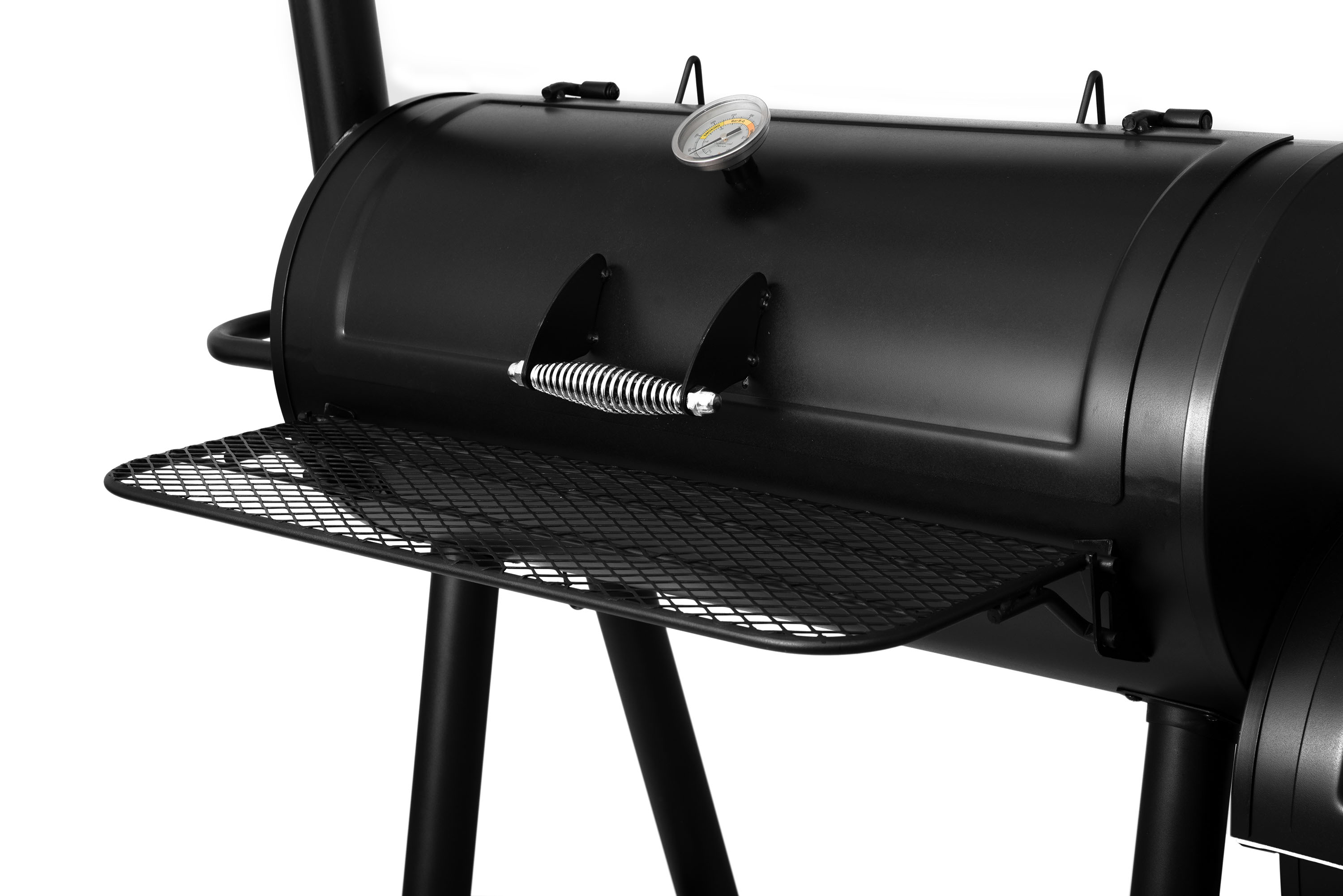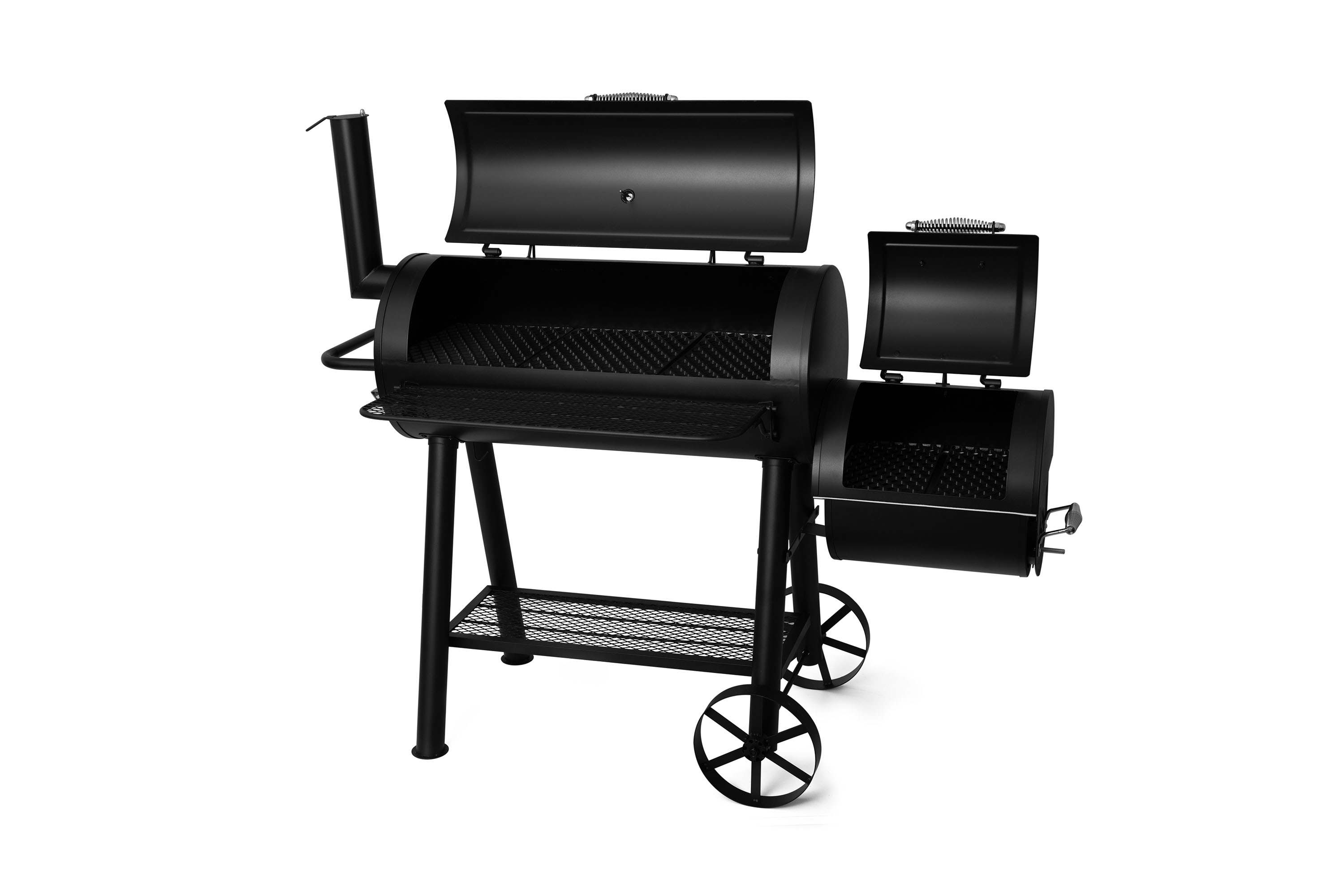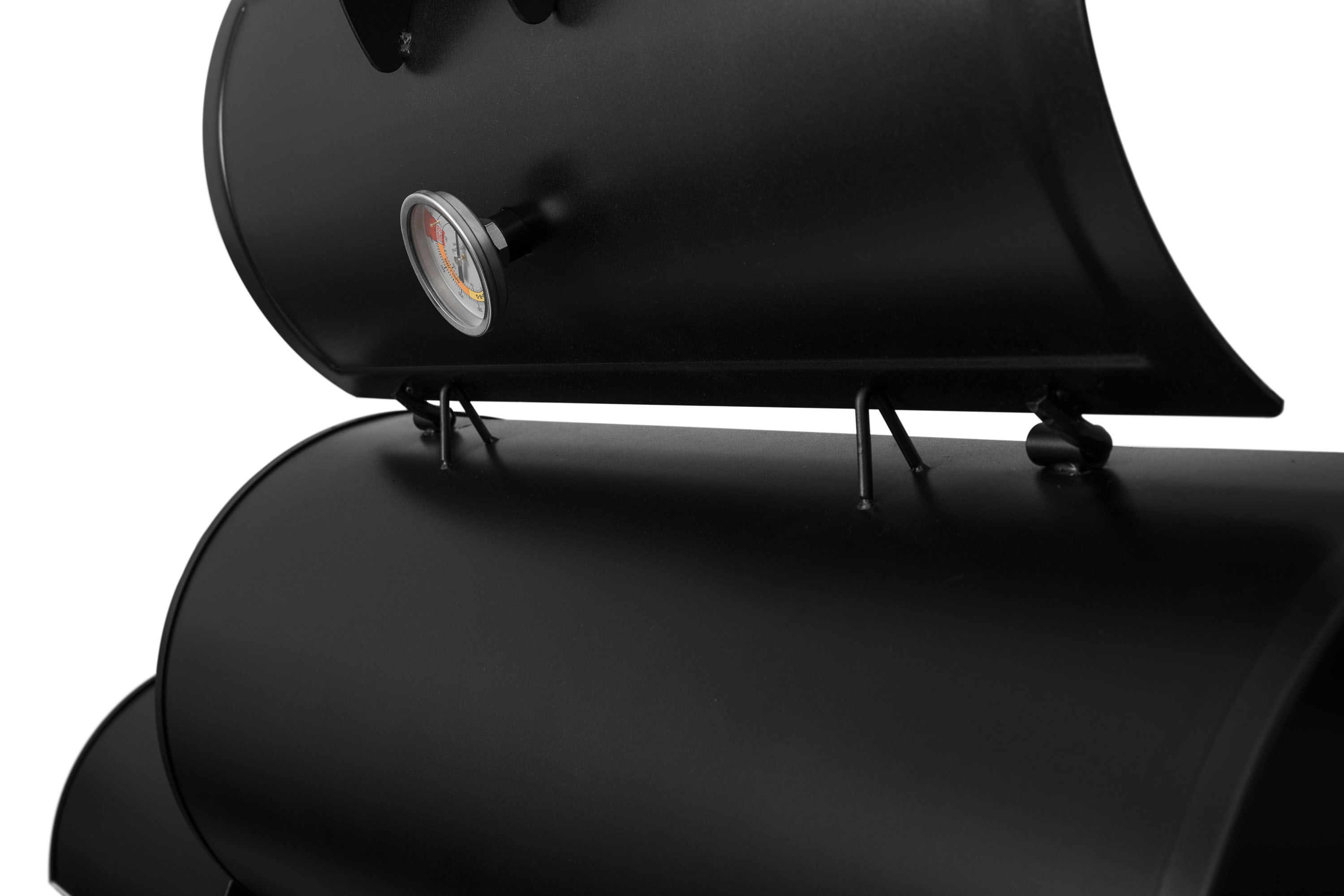 Velký zahradní gril na dřevěné uhlí má dvě topeniště a grilovací plochy s litinovými rošty. Můžete v něm grilovat i udit, chytré provedení grilu vám umožní připravovat pokrmy v různé intenzitě žáru současně. K roztopení grilu použijte dřevěné uhlí, dřevo nebo brikety.