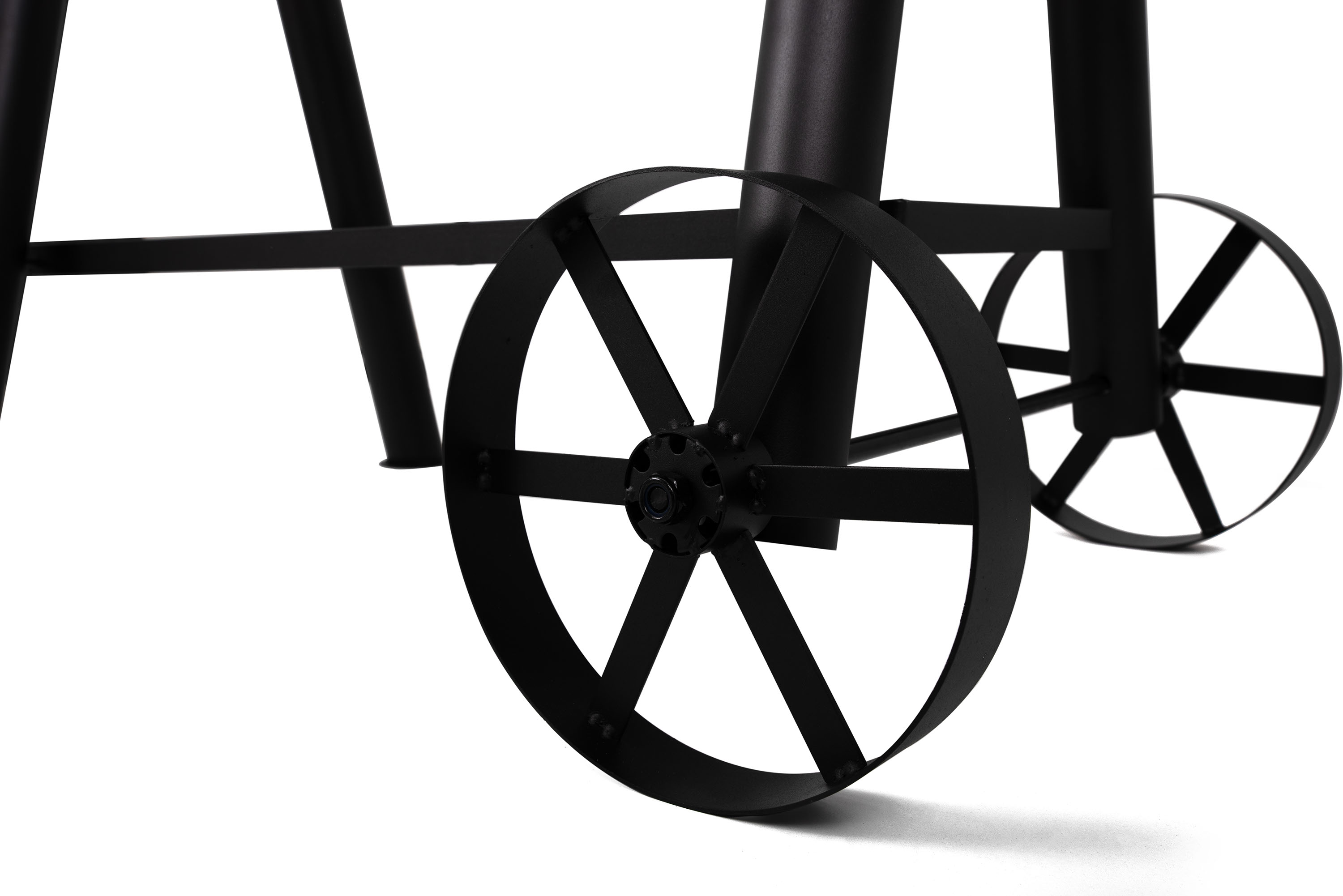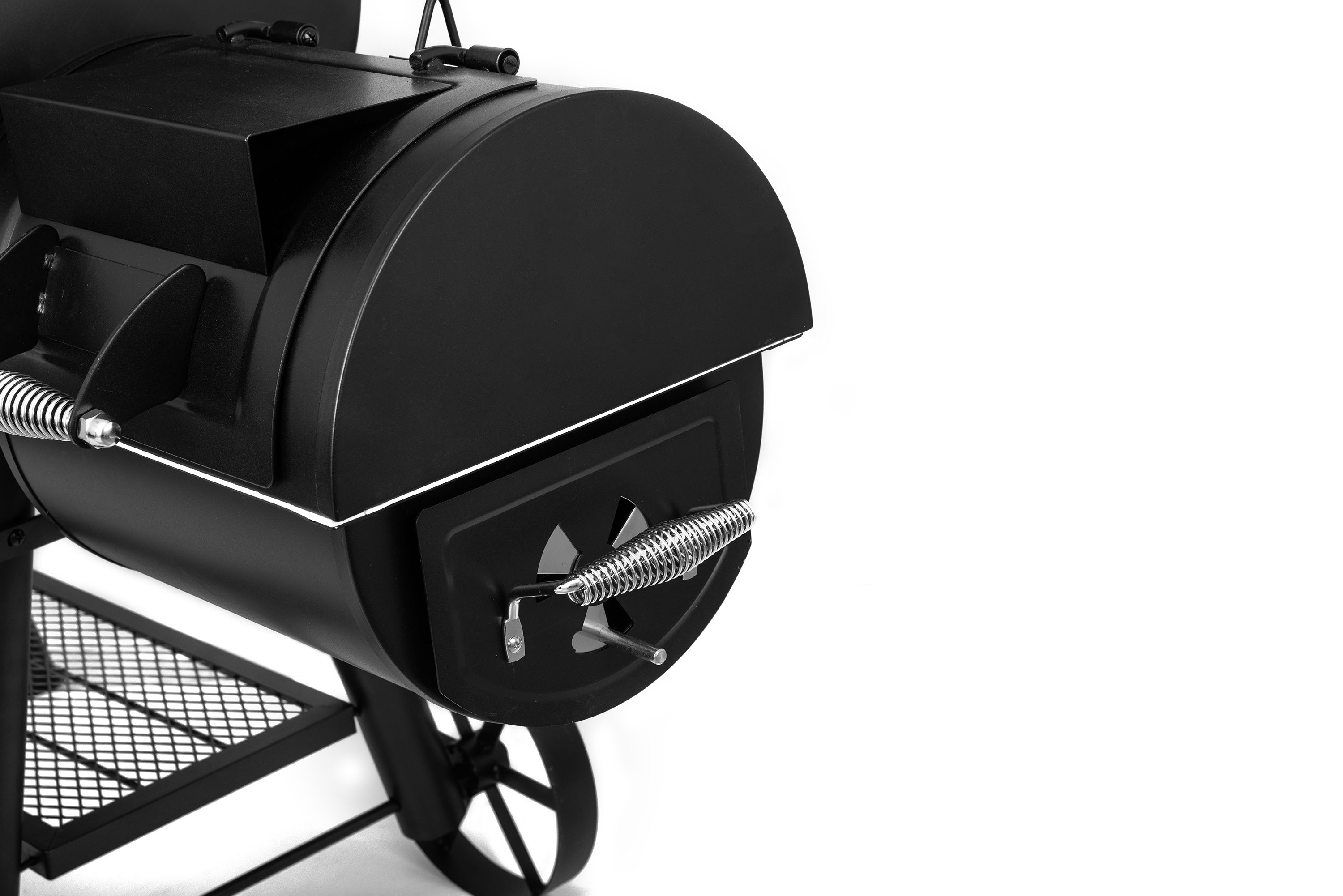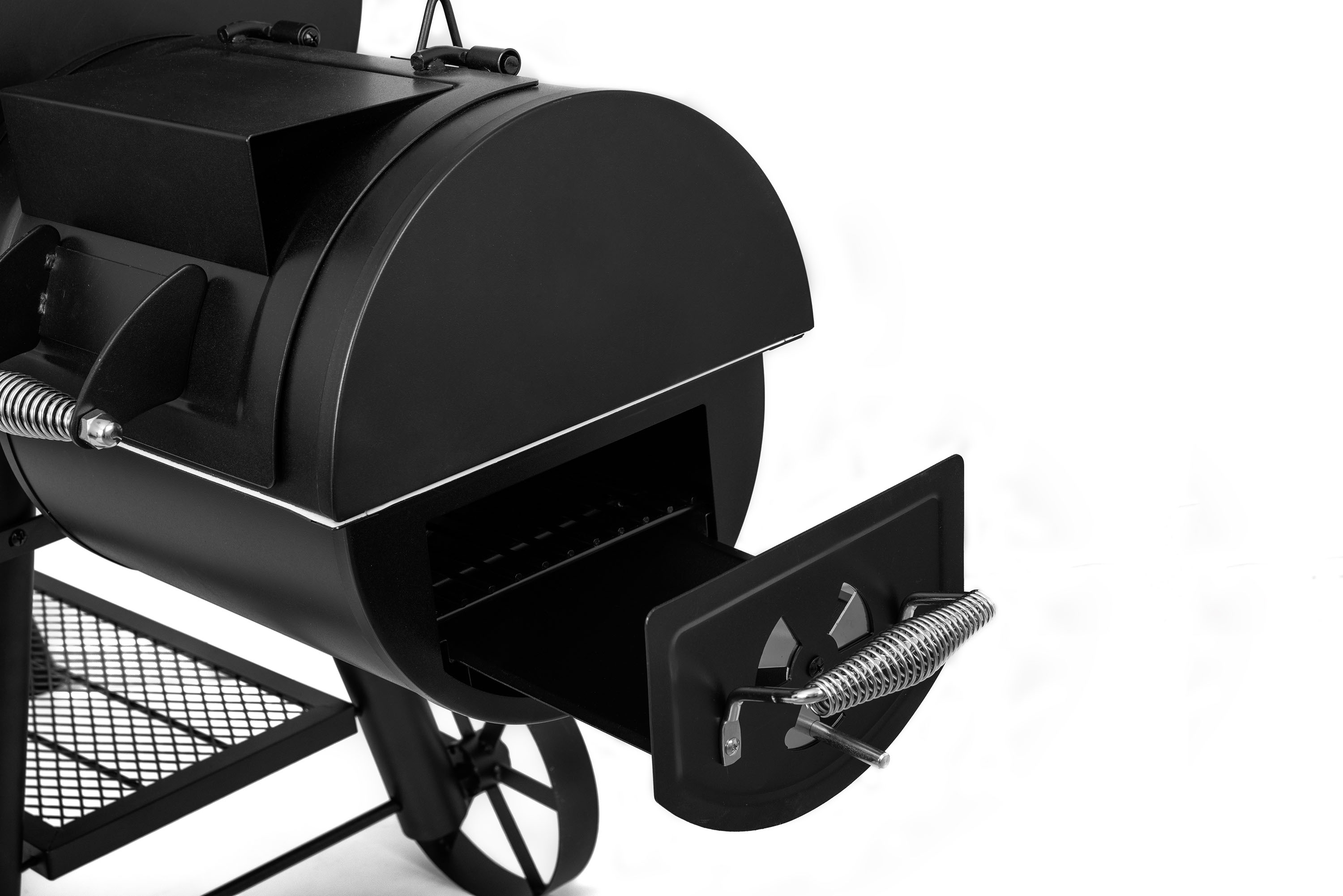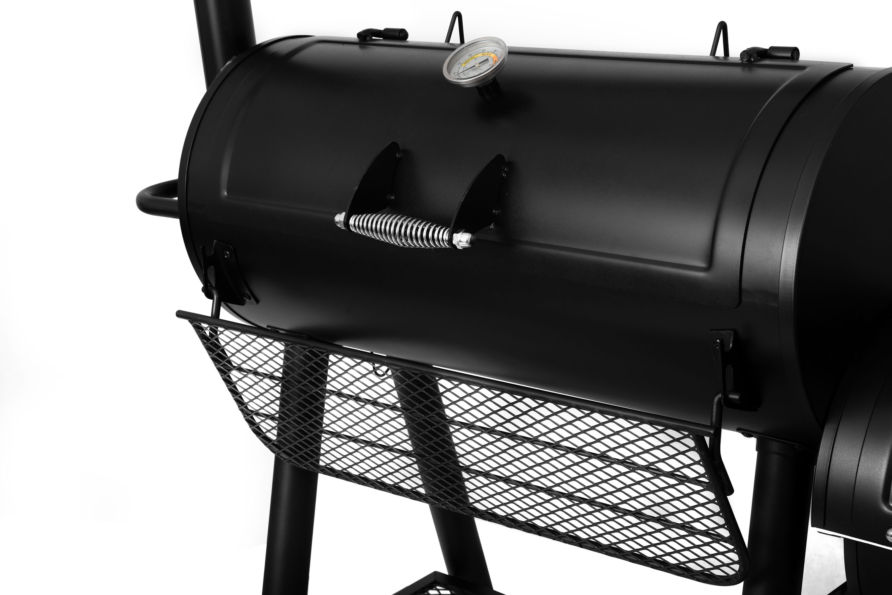 Velký zahradní gril na dřevěné uhlí má dvě topeniště a grilovací plochy s litinovými rošty. Můžete v něm grilovat i udit, chytré provedení grilu vám umožní připravovat pokrmy v různé intenzitě žáru současně. K roztopení grilu použijte dřevěné uhlí, dřevo nebo brikety.