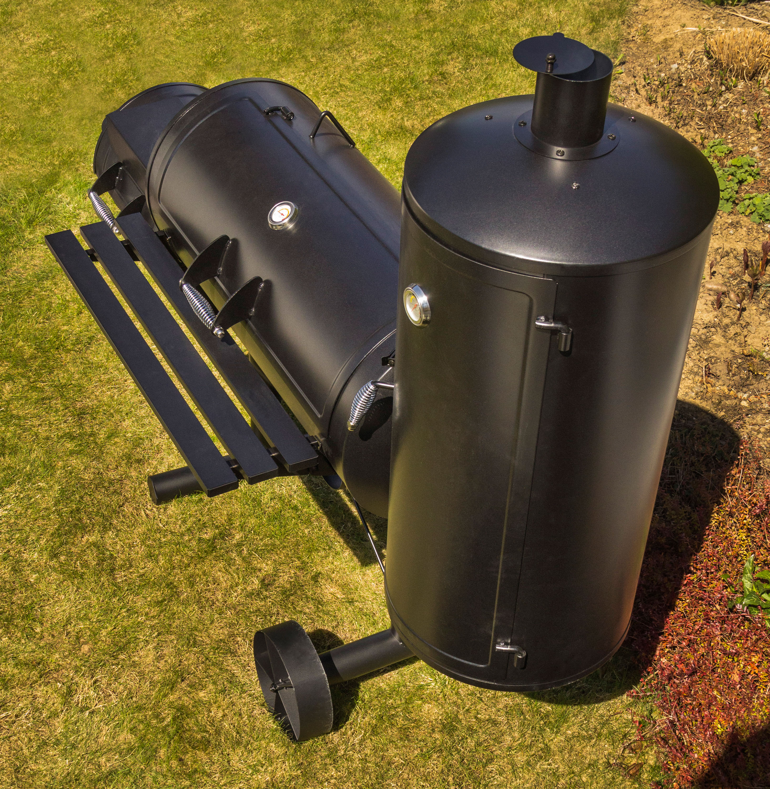 Velký a masivní zahradní gril s udírnou má dvě topeniště a grilovací plochy a samostatnou udírnu. To znamená, že na rozdíl od předchozích modelů se k uzení nevyužívá jedna z grilovacích ploch, ale zvětšila se kapacita grilu. Můžete zároveň například grilovat zeleninu a přílohy na menší grilovací ploše, steaky a hamburgery na větší grilovací ploše a udit klobásy a sýry v udírně. Můžete tedy připravovat pokrmy v různé intenzitě žáru současně.