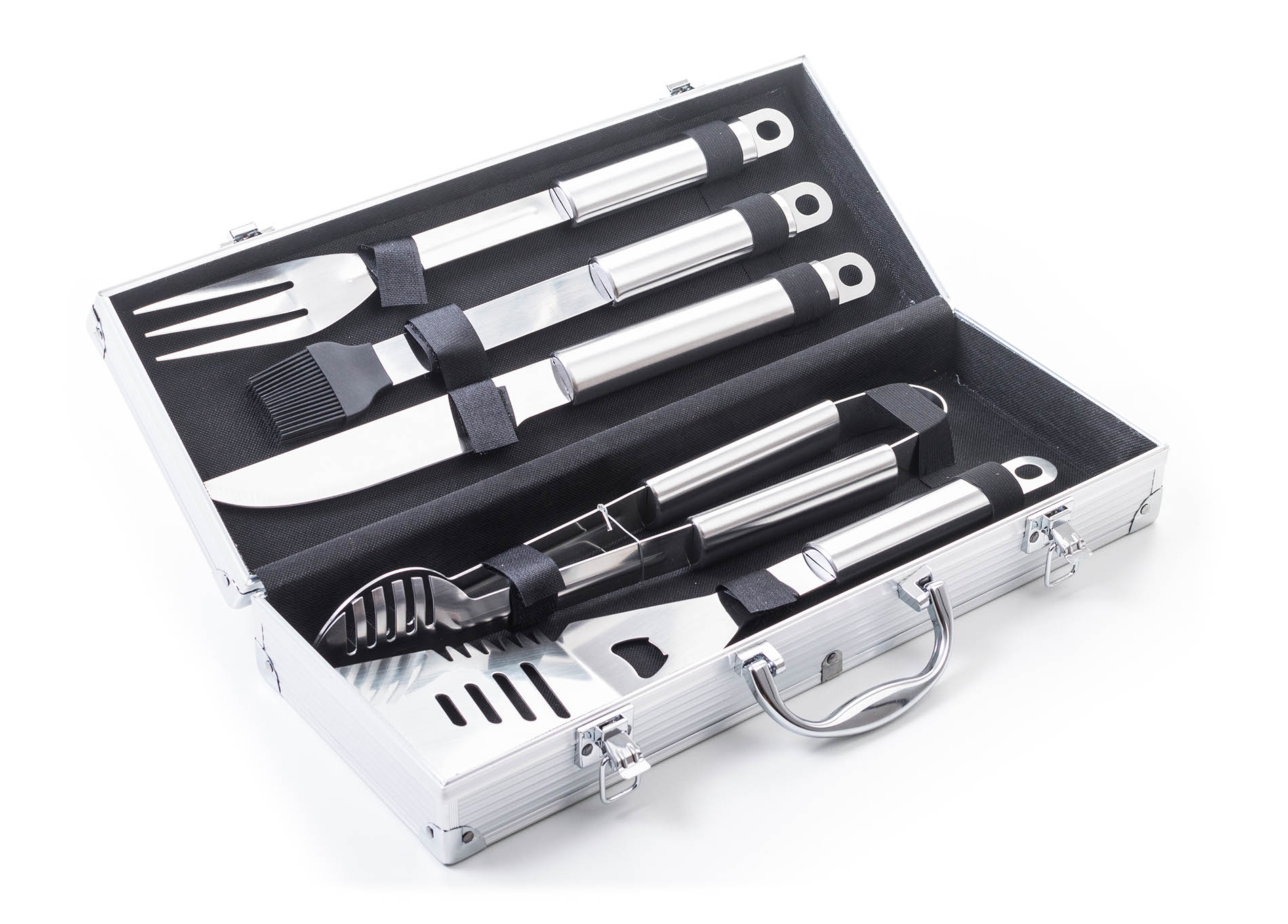 Sada obsahuje kompletní nástroje pro grilování bez potíží. Součástí