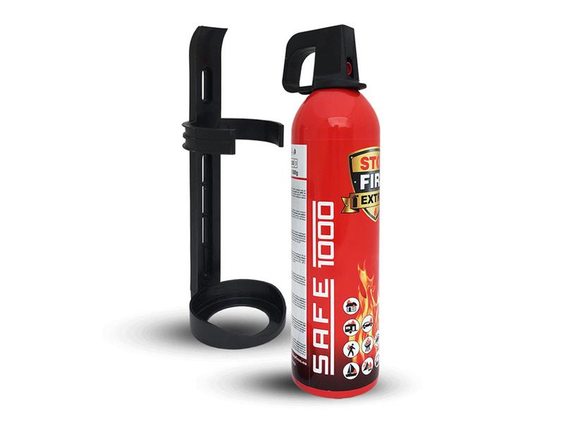 Komplet hasicí sprej SAFE 1000 spolu s držákem SAFE 100F. Hasicí