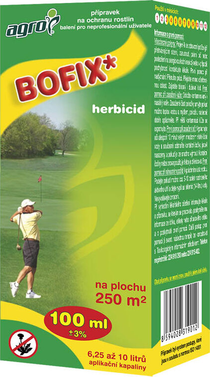 Herbicid Agro Bofix je přípravek o objemu 100 ml, který ničí jen specifickou skupinu rostlin. V tomto případě se jedná o dvouděložné plevele v trávnících, mezi které patří jitrocel, smetánka, ptačinec žabinec, konopice, hluchavka, svlačec, penízek, ostružiník, jetel, lebeda, pcháč oset a další podobné rostliny. Nepůsobí na trávy, proto vaše zahrádka působí dokonale, zdravě a upraveně.