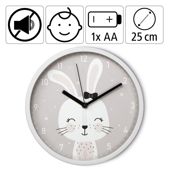 Nástěnné hodiny s rozkošným zajíčkem od značky Hama. Hodiny nabízí analogové zobrazení času, tichý chod bez hlasitého tikání a velký ciferník s arabskými číslicemi. Nechybí ani hodinová a minutová ručička.