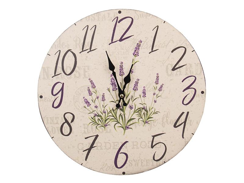 Nástěnné hodiny s dekorem. Vlastnosti: - Materiál: dřevo, plast, kov - Napájení: 1x 1,5V AA baterie (není součástí) - Rozměry: pr. 34 cm