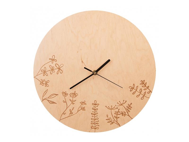 Nástěnné hodiny s dekorem. Materiál: dřevo, plast, kov. Napájení: 1x 1,5V AA baterie (není součástí). Rozměry: pr. 34 cm.