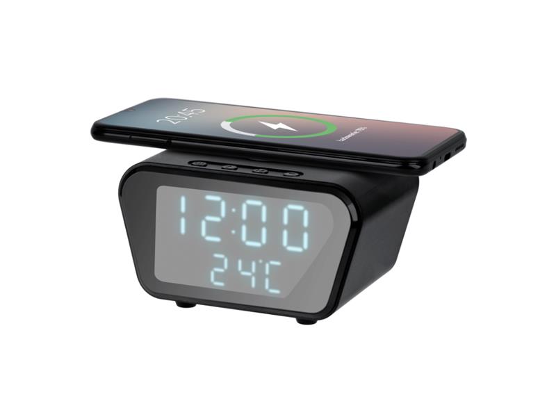Hodiny s budíkem REBEL RB-6303-B Technické parametry: - Funkce indukční nabíječky - 3 nastavení budíku - Přehledný LED displej - Vestavěný teploměr - Bezdrátový nabíjecí výkon: 5 W, 7,5 W, 10 W - Vstupní napětí: 9 V 2 A (port USB - C) - Rozměry: 110 x 79 x 65 mm - Hmotnost: 235 g