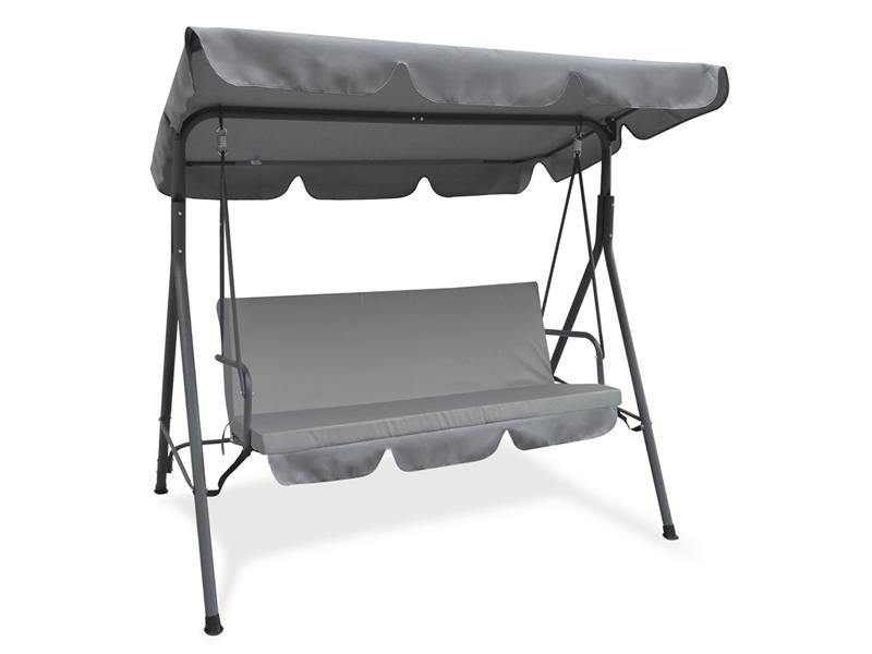 Stylová pohodlná zahradní houpačka s kovovou konstrukcí. Sedák pojme až tři osoby o celkové hmotnosti 240 kg. Lavice je zavěšena v pevném rámu, houpačka je tak stabilní. Díky vysokému polstrovanému sedáku při odpočinku nikde nic netlačí. Široká naklápěcí stříška s ozdobným lemováním výborně chrání před slunečními paprsky, ale i letním deštíkem. Stříška i polstrování jsou vyrobeny z pevného polyesteru 140 g/m2 ve středně šedém odstínu.
