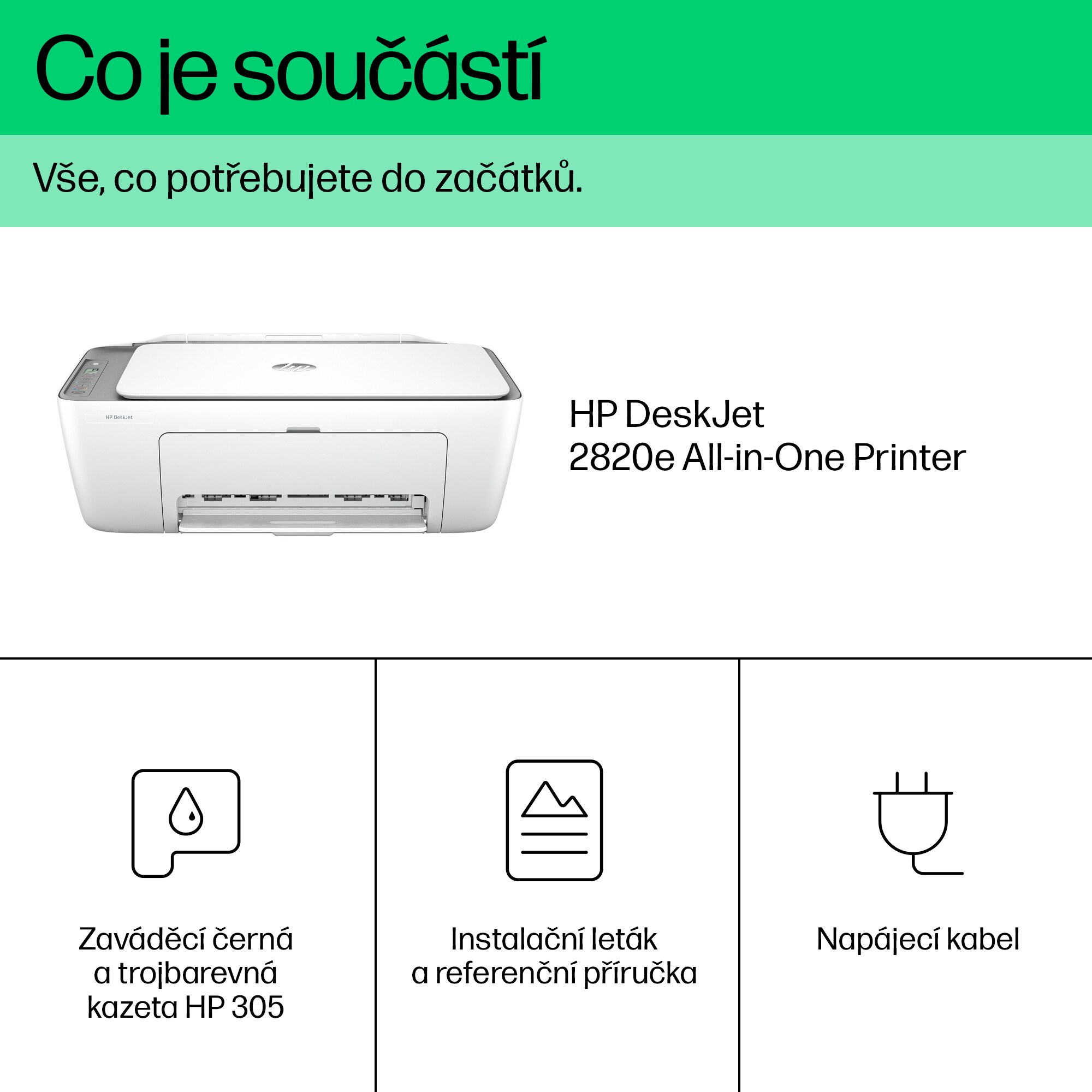 Obsah balení:HP DeskJet 2820e All-in-One Printer; HP 305 Setup Black Cartridge;