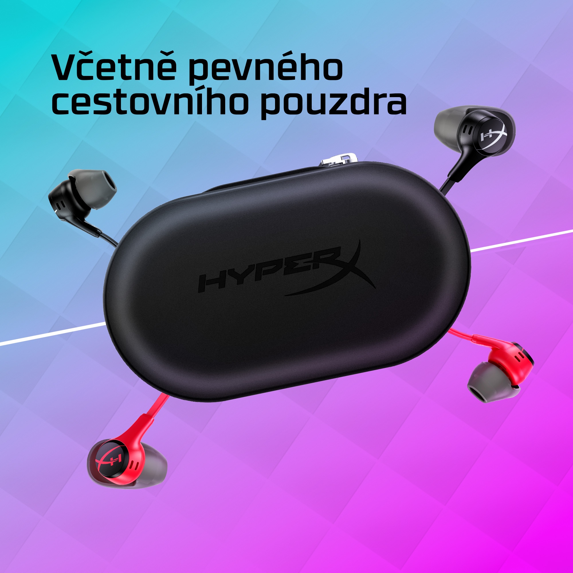 Obsah balení Cloud Earbuds II, pevné cestovní pouzdro, úvodní