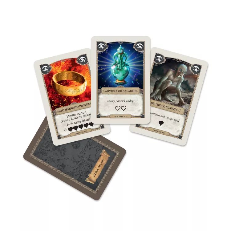 V balení najdete herní plán, 50 karet, 20 kartonových figurek, 8 kostek, desku kostek, žeton prstenu, žeton Gandalfa, žeton Stromovouse a také česká a slovenská pravidla. Naplánujte se svými blízkými herní večer nebo se zabavte doma během deštivého odpoledne. Vyhráváte všichni společně ve chvíli, kdy nositel prstenu dojde k Hoře osudu.