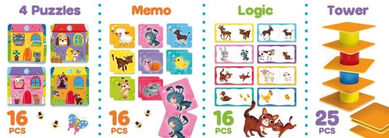 Krásná sada 4 různých her pro děti od 1 roku do 4 let. Sada obsahuje pexeso (16 kusů), puzzle (4 obrázky), spojení máma a mládě (16 kusů) a věž (25 kusů). Vyrobeno z bezpečných materiálů. Carotina je značka společnosti Lisciani a představuje její vzdělávací jádro. Značka je především zaměřená na předškoláky a kojence.