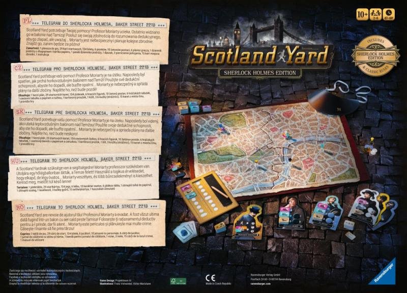 Zábavná stolní hra nadchne všechny fanoušky geniálního Sherlocka Holmese. Scotland Yard pátrá po uprchlém profesoru Moriartym, který byl naposledy spatřen v horkovzdušném balónu nad Temží. Na vás je, abyste ho pomocí dedukčních schopností dopadli. Nebude to ovšem vůbec snadné. V rámci hry si můžete vybrat, jestli budete hrát za detektivy, nebo za Moriartyho. Řídit se můžete jak původními pravidly, tak speciálními pravidly Sherlocka Holmese.