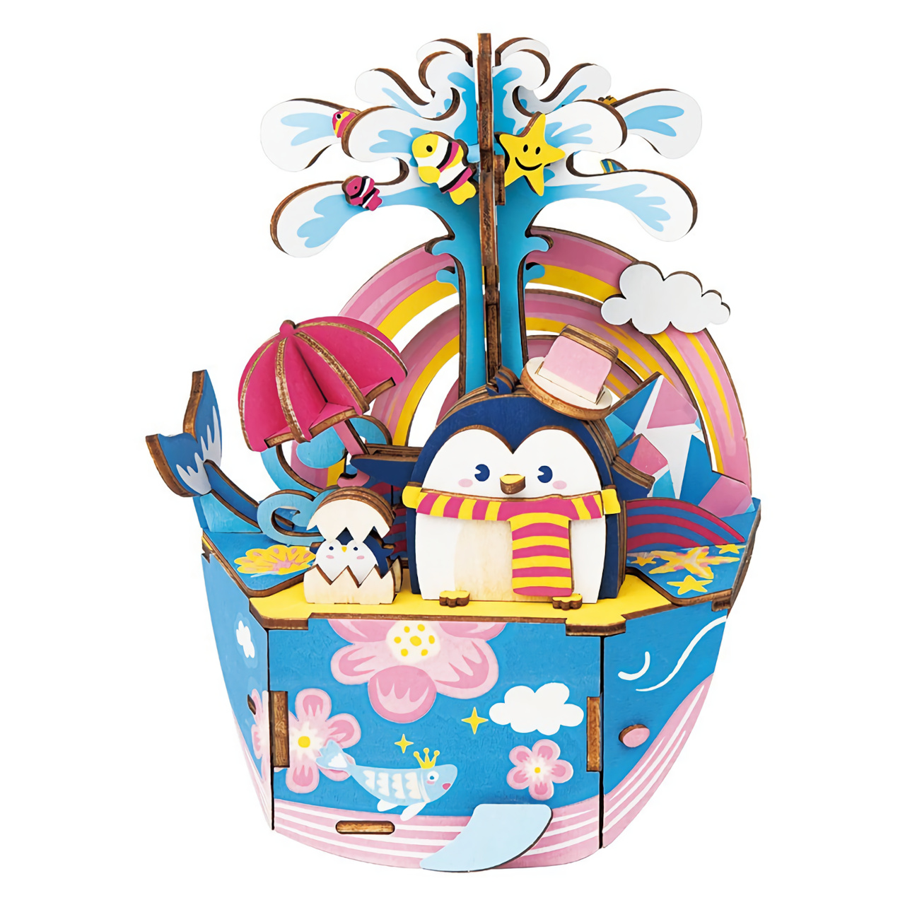 Detailní barevný model zábavní atrakce s mořskými živočichy. Skládačky hracích skříněk Robotime jsou nabízeny v mnoha podobách, přírodních i barevných, lišících se nápaditými pohyblivými detaily doprovázejícími zvuk. Nezaskočí vás svou náročností a po sestavení zkrášlí poličku.
