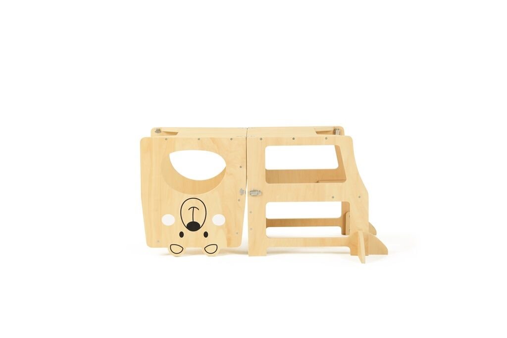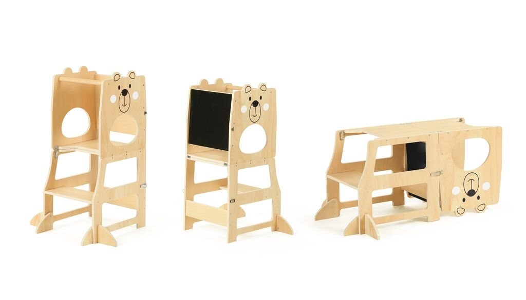 Učící věž 3 v 1 značky 2Kids Toys funguje jako praktická víceúčelová stolička. Zapojuje se vaše dítě rádo k vaření či jiné tvůrčí činnosti, ale je ještě příliš malé, aby mělo dobrý výhled a dosah na pracovní desku nebo kuchyňskou linku? Nechejte ho, aby vylezlo na věž. Nemusíte už používat obyčejnou židli. Roztomilý design v podobě medvídka nadchne každé dítě.