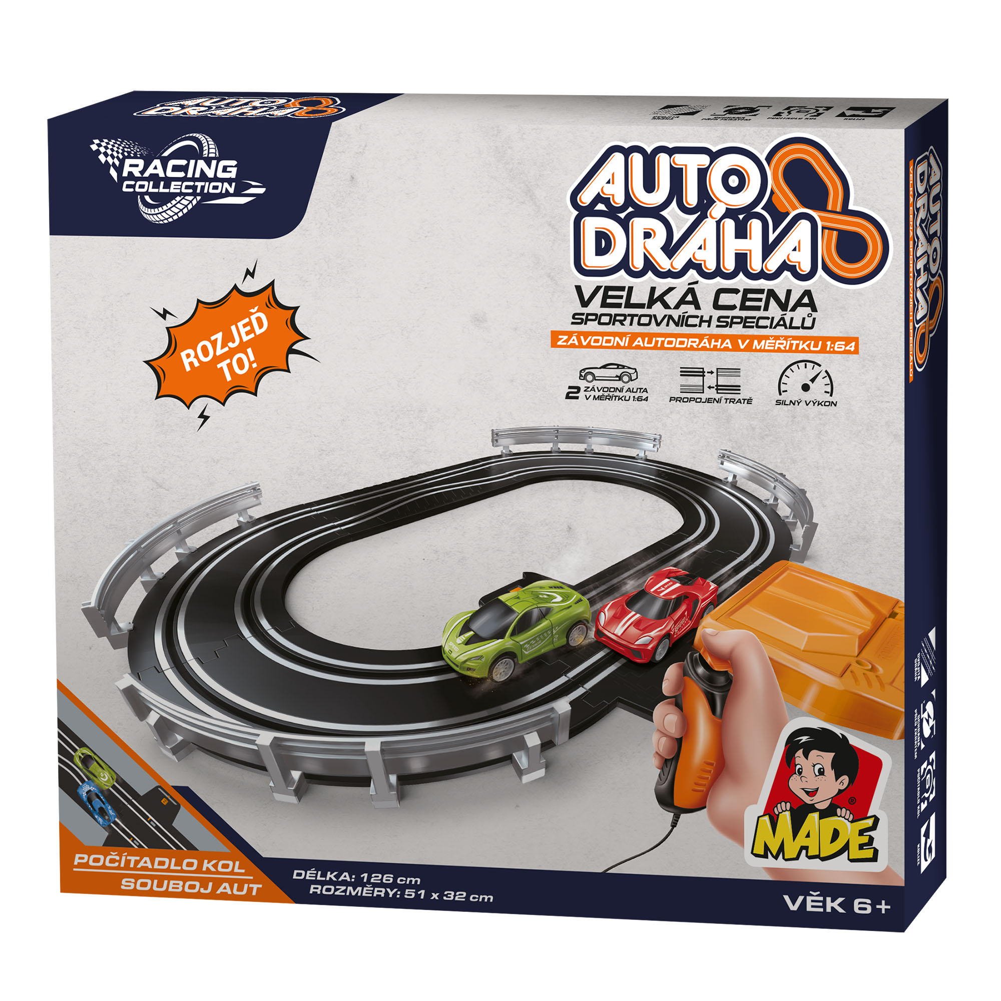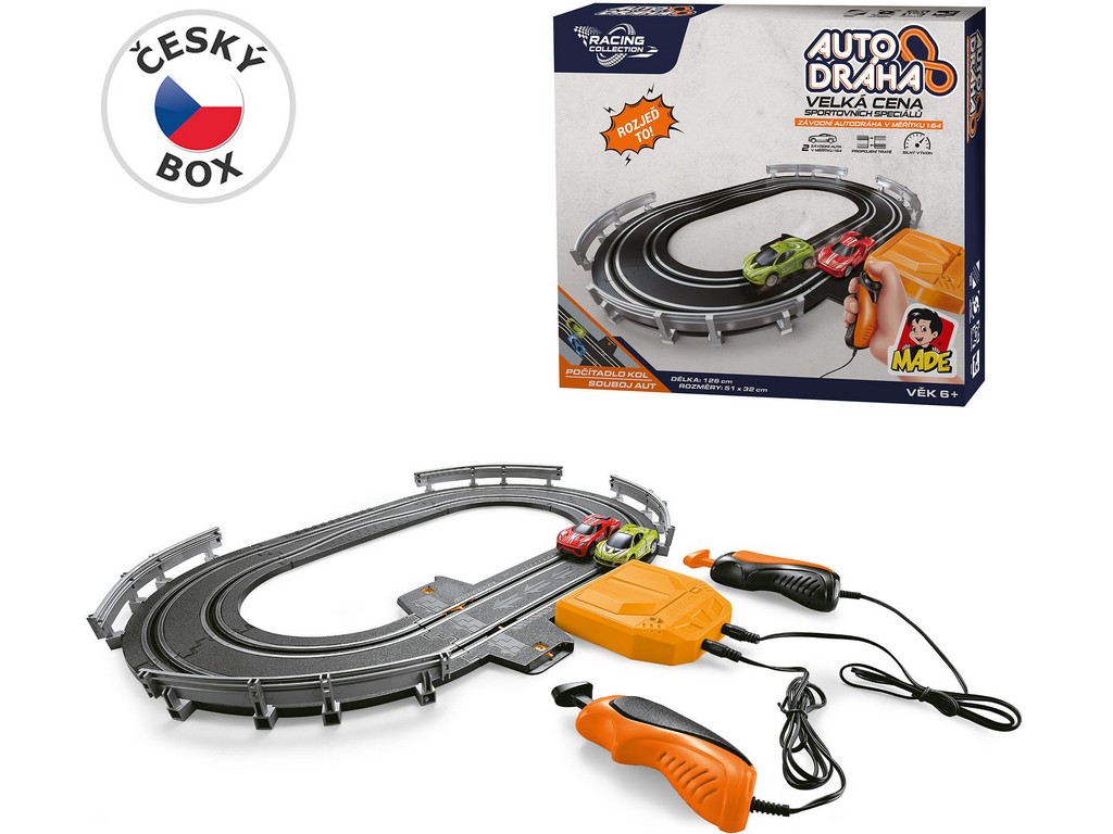 Autodráha Racing collection udělá radost každému malému závodníkovi a nadšenci do autíček. Autíčka ovládáme pomocí ovladače, kde si přizpůsobují závodníci rychlost. Stačí sestavit trať a vyrazit. Oválová trať s prudkými zatáčkami vyzkouší šikovnost malého řidiče v ovládání autíčka. Balení obsahuje 2 závodní auta, 2 ovladače s USB kabelem pro externí napájení. Celková délka trati je 126 cm. Kdo pojede rychleji, objede kolečko jako první a vyhraje?