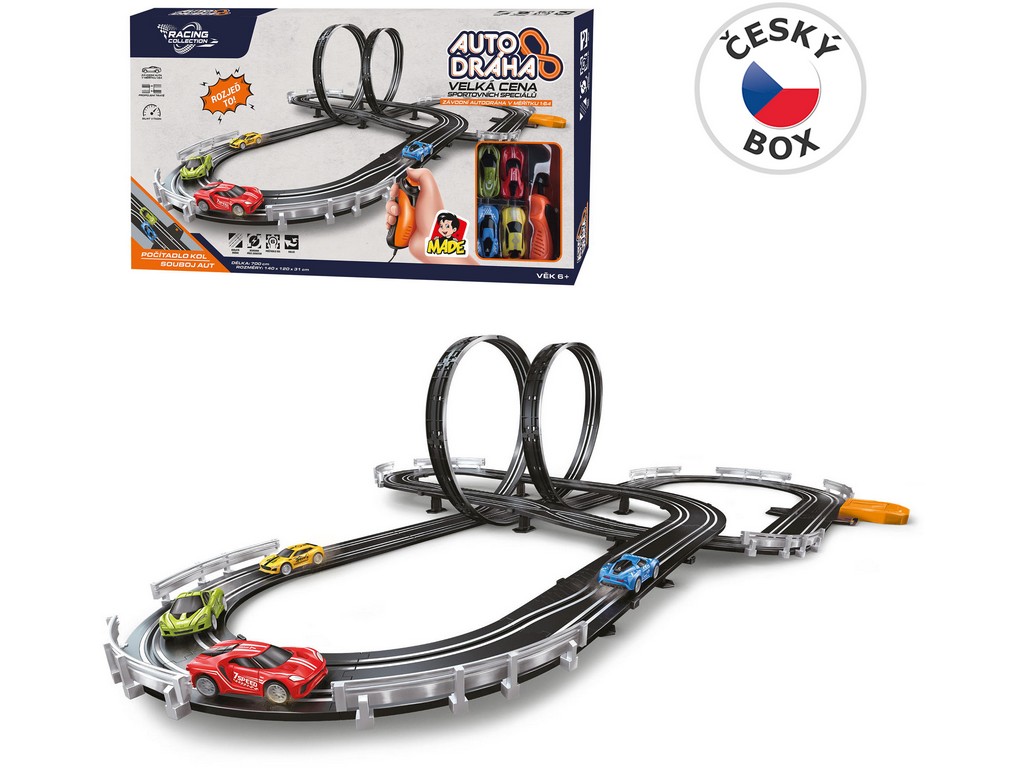 Autodráha Racing Collection udělá radost každému malému závodníkovi a nadšenci do autíček. Užije si rychlou jízdu a pomocí 2 ovladačů uspořádá se svými sourozenci nebo kamarády závody. Stačí sestavit trasu dlouhou 700 cm a vyrazit. Cestu si váš potomek může znesnadnit a vytvořit prudké zatáčky a lopingy. Balení obsahuje 4 různě barevná auta, takže si vybere „závoďák“ ve své oblíbené barvě a odstartuje závody. Kdo pojede rychleji, zvládne náročné úseky a jako první dorazí do cíle?