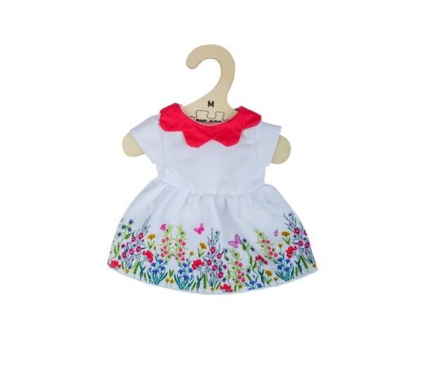 Tuto krásnou kolekci oblečení pro hadrové panenky Bigjigs Toys si jistě zamilujete. Bílé květinové šaty s červeným límečkem můžete obléci na panenky o velikosti 34 cm. Součástí oblečení je také ramínko, které pohodlně zavěsíte na praktický věšák. S panenkami a jejich doplňky od značky Bigjigs si vaše dětičky užijí spoustu zábavy. Každý den mohou své panenky převléci do nového outfitu a vyrazit například do města nebo do školky.