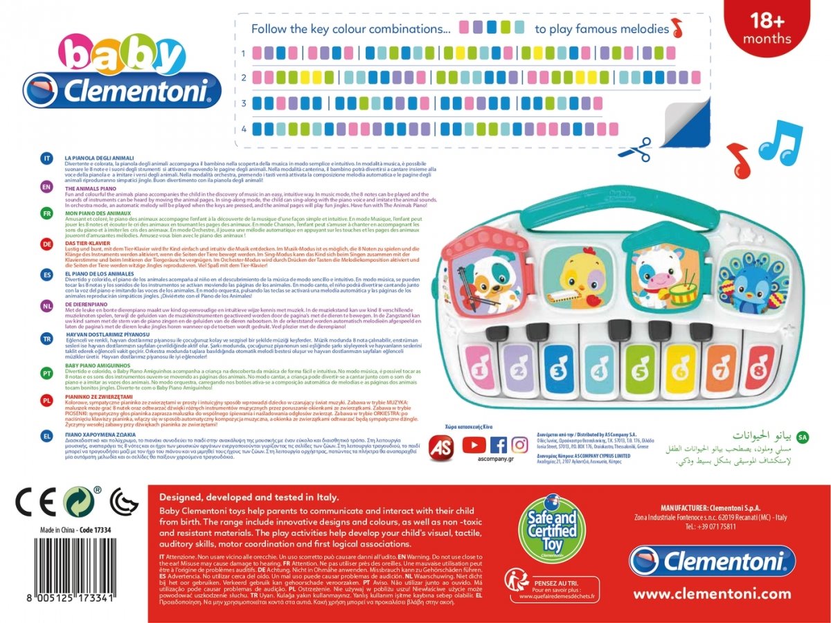 Hračka Clementoni s motivy zvířátek představuje miniaturní imitaci elektrického piana, kterou ocení všichni malí hudebníci od 18 měsíců. Klaviatura má rozsah 1 oktávy a skládá se z 5 černých a z 8 bílých kláves, které vaší ratolesti zábavnou formou otevřou dveře do zázračného světa hudby. Piano má 2 interaktivní stránky a nabízí 3 režimy přehrávání. V hudebním režimu lze přehrávat 8 not a zvuky nástrojů, v módu zpívání může dítě zpívat s hlasem piana a napodobovat zvuky zvířat a v režimu orchestru se po stisknutí tlačítek přehraje automatická melodie. Hudba je fantastický způsob, jak se děti mohou vyjádřit!
