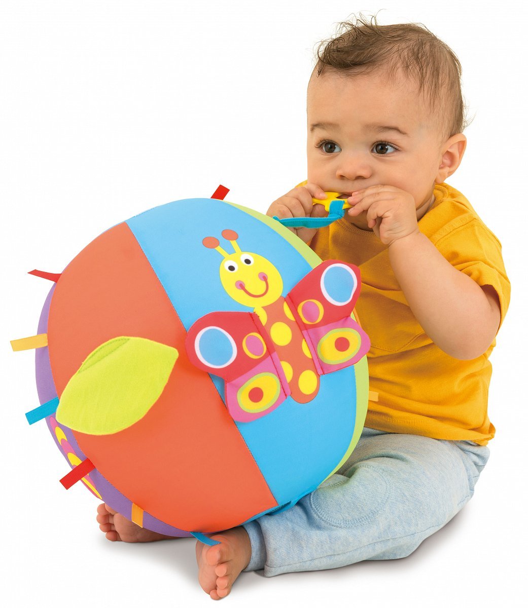 Velký nafukovací míč Galt Activity Ball potěší malé kojence ve věku od 6 měsíců, kdy nabízí hned 6 různých aktivit pro rozvoj smyslů a psychomotorických dovedností. Má potah z jemné látky, díky čemuž lze prát v pračce a je velice příjemný na dotek, takže je ideální pro dětské objímání a mazlení. Navíc je použitý materiál dostatečně lehký, takže vaše ratolest poprvé okusí míčové hry. Po obvodu míče se poté nacházejí pestrobarevné stuhy a další doplňky pro zábavné hraní všeho druhu, mezi které patří pískací motýlí křídlo, kousátko ve tvaru květiny, krásné okvětní lístky, včelka s lesklými křídly, chlupatá housenka a vykukovací (peep-bo) list.